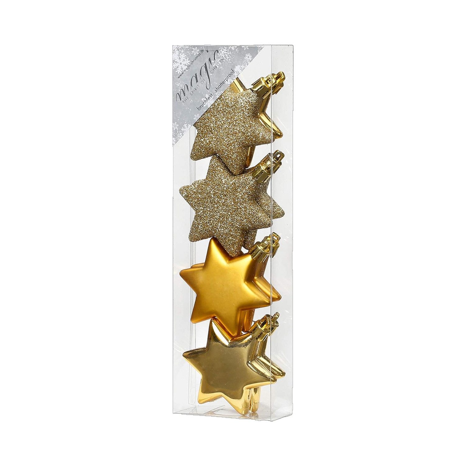 Die Inge-Glas Weihnachtssterne Gold bringen festlichen Glanz in deine Weihnachtsdekoration. Das 8er-Set besteht aus bruchsicheren Kunststoff-Sternen mit einem Durchmesser von 6 cm perfekt für Weihnachtsbäume, Adventskränze, Fensterdekorationen oder als Tischschmuck. Der edle Goldton sorgt für eine warme, elegante Optik, während der Mix aus glänzender und matter Oberfläche für abwechslungsreiche Lichtreflexe sorgt. Sterne sind ein klassisches Symbol für Weihnachten und setzen besondere Akzente in jeder Dekoration. Die Sterne bestehen aus bruchsicherem Kunststoff, sind leicht, stabil und wiederverwendbar ideal für Haushalte mit Kindern oder Haustieren. Durch die praktische Aufhängeöse lassen sie sich schnell und sicher an Ästen, Kränzen oder Geschenken befestigen. Ob als Baumschmuck, als Deko-Highlight auf dem Tisch oder als festlicher Geschenkanhänger mit den Inge-Glas Sternen in Gold setzt du elegante und sichere Deko-Akzente für Weihnachten.
