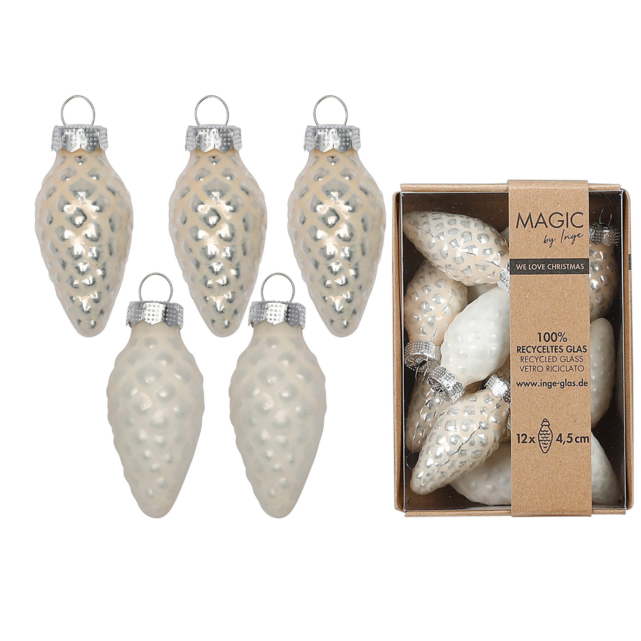 PRODUKT: Weihnachtsbaumschmuck Zapfen / GRÖSSE: ca. 4,5 cm / MATERIAL: Glas / INHALT: 12 Glaszapfen / FARBTON: ivory - elfenbein - cremeweiß - wollweiß
