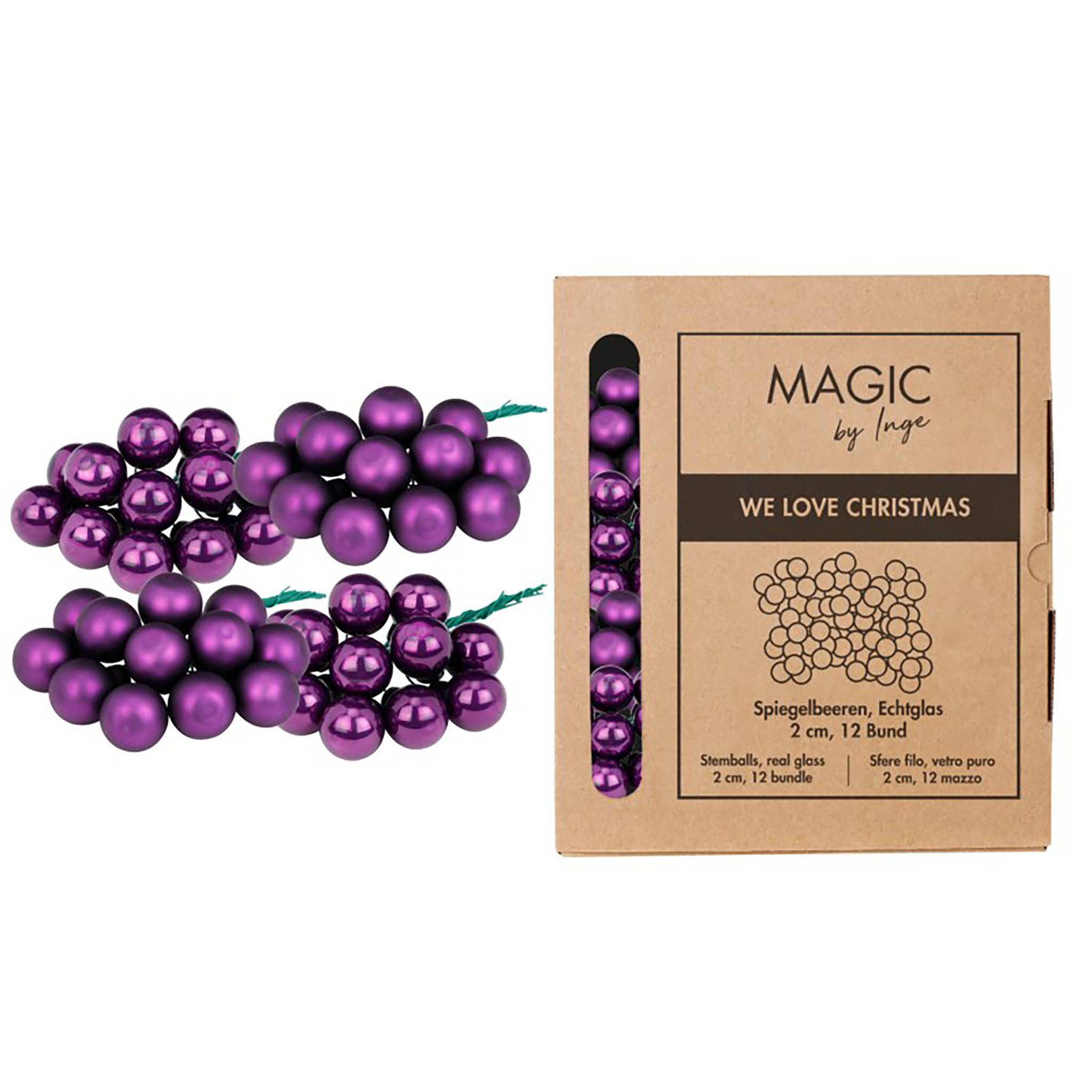 Christbaumschmuck / Weihnachtskugeln / Glaskugeln / Spiegelbeeren am Draht Material: Glas Durchmesser: ca. 2 cm Drahtlänge: ca. 8-10 cm Packungsinhalt: 12 Bündel mit je 12 Glaskugeln am Draht in Karton - Box Farbton: lila - purpur - lavendel Farbserie Purple Symphony: Violett mischt sich aus emotionalem Rot und rationalem Blau. Die Farbe steht für Mystik, Spiritualität und Leidenschaft. Ein Hauch Violett bringt sinnlichen Glamour ins Zuhause. - kleine glänzende & matte Dekokugeln aus echtem Glas, ohne Ösen zum Aufhängen, maschinelle Herstellung - in einer nachhaltigen Kartonbox, die als eine Aufbewahrungsbox verwendet werden kann - jede kleine Christbaumkugel ist an einem Draht geklebt und lässt sich einfach an Zweigen, Ästen oder am Weihnachtsbaum befestigen Mit diesen mini - Glaskugeln setzen Sie stilvolle Akzente und schaffen eine festliche Atmosphäre in Ihrem Zuhause. Die kleinen Kugeln sind perfekt als Baumschmuck für kleinere Christbäume oder als zusätzlicher Baumbehang an größeren Bäumen. Doch nicht nur als Weihnachtsbaumschmuck eignen sich die Dekokugeln. Als Weihnachtsdeko verschönen die Minikugeln die Festtagstafel oder andere weihnachtliche Dekorationen. Ebenfalls als mini Deko - Elemente finden die kleinen Weihnachtskugeln Einsatz beim Dekorieren von Weihnachtsgeschenken. Die Christbaumkugeln mit Draht lassen sich auch wunderbar mit anderen Weihnachtsbaumkugeln, Figuren und Christbaumschmuck kombinieren. Stil & Aufmachung: uni & einfarbig, glänzend, matt Farbgruppe: lila - violett Die Farben können aufgrund von unterschiedlichen Monitor Einstellungen vom Foto leicht abweichen