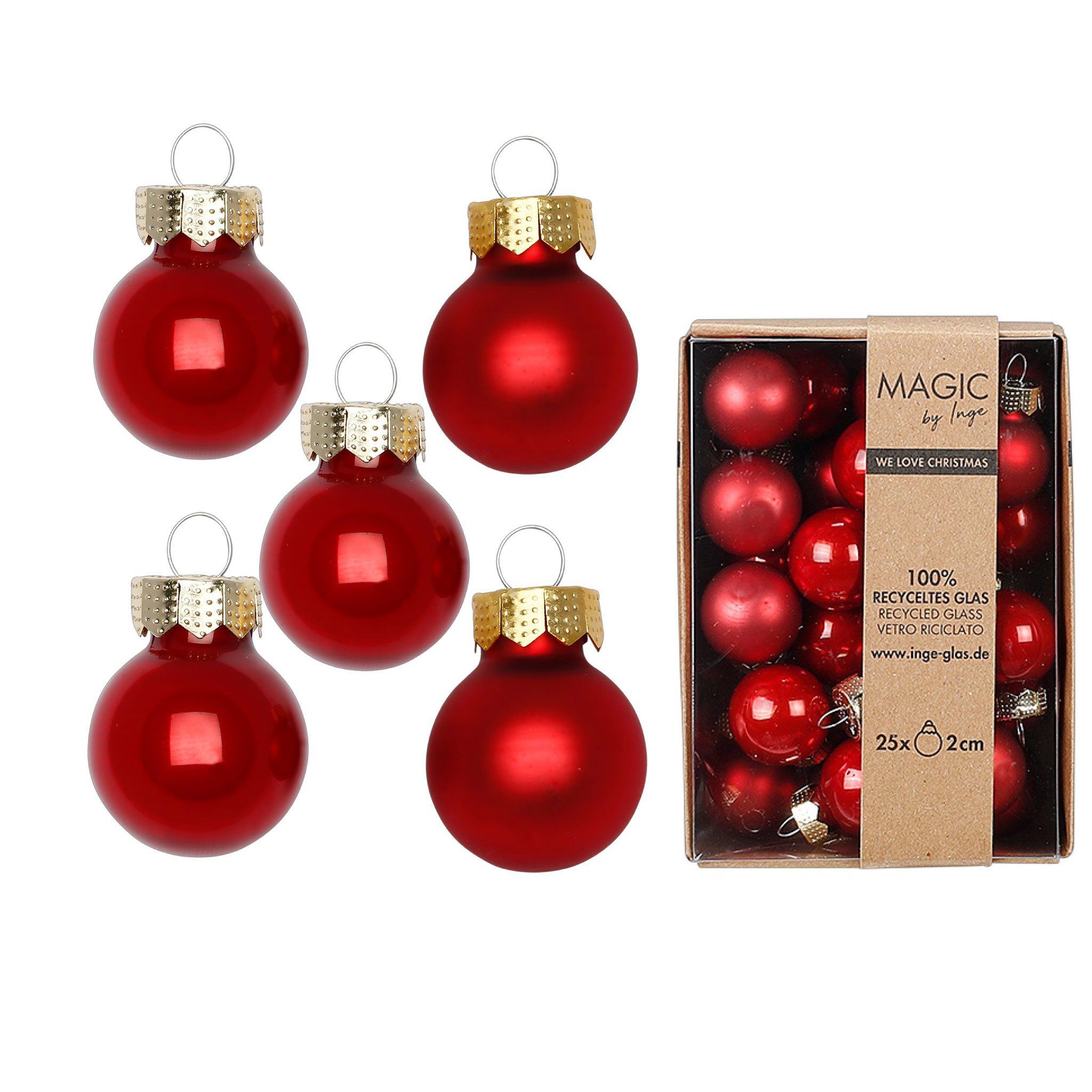 PRODUKT: Mini Weihnachtskugeln / DURCHMESSER: ca. 2 cm / MATERIAL: Glas / INHALT: 25 Kugeln / FARBTON: dunkelrot - weinrot - ochsenblut