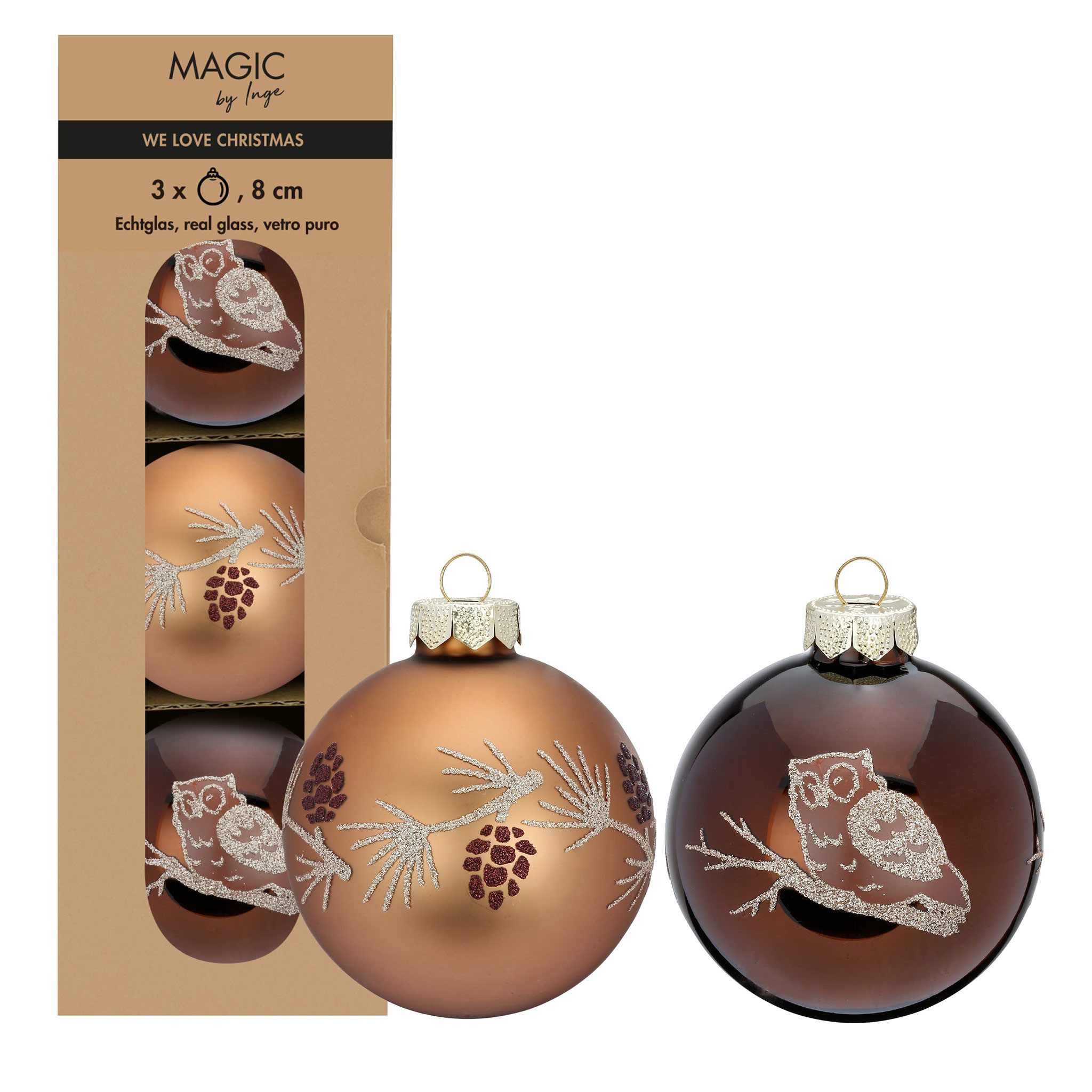PRODUKT: Weihnachtskugeln mit Eule Zweig Zapfen Motiv / DURCHMESSER: ca. 8 cm / MATERIAL: Glas / INHALT: 3 Kugeln / FARBTON: Mix aus hellbraun - sand, goldbraun und dunkelbraun