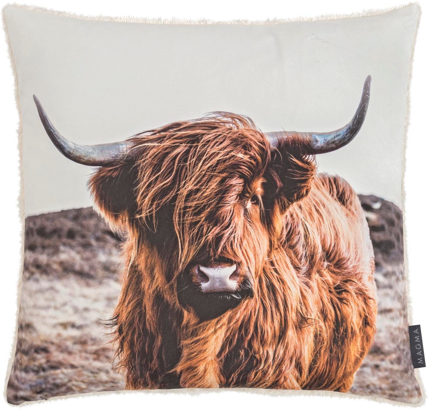 Diese Kissenhülle mit Motivdruck Hirschkopf oder Yak verzaubert Ihr zu Hause in eine kuschelige Wohnlandschaft. Aus dem neuen Katalog der Firma Magma tritt dieser neue Kissenbezug hervor. Die Kissenhülle ist weich und flauschig. Die Rückseite ist flauschig plüsch mit einem einfarbigen weichem Stoff versehen. Die Kissenhülle hat einen eingenähten Reißverschluss in der jeweiligen passenden Farbe.