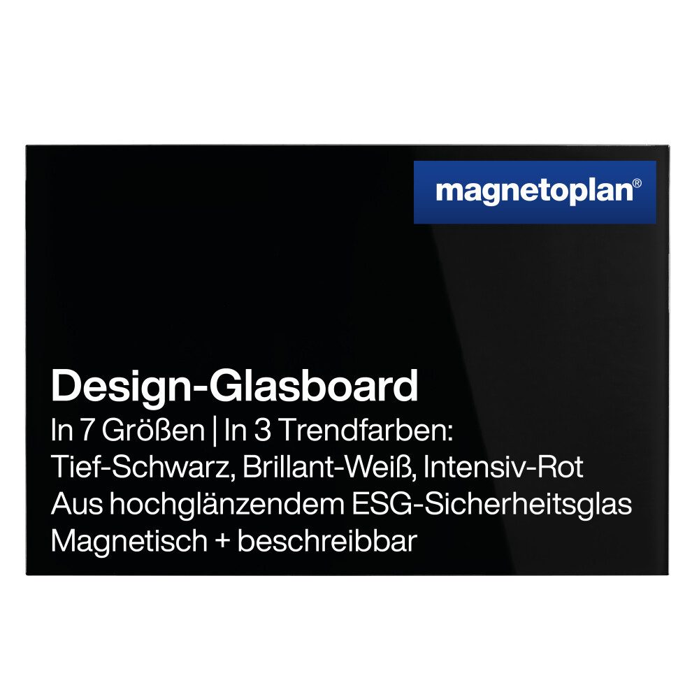 Entdecken Sie das magnetoplan Design-Glasboard in tiefem Schwarz, eine moderne und elegante Alternative zu herkömmlichen Whiteboards. Mit seinen großzügigen Abmessungen von 600 x 400 mm bietet dieses Glasboard ausreichend Platz für Ihre Ideen, Notizen und Fotos. Dank seiner magnetischen und beschreibbaren Oberfläche ist es vielseitig einsetzbar und überzeugt durch sein stilvolles Erscheinungsbild.