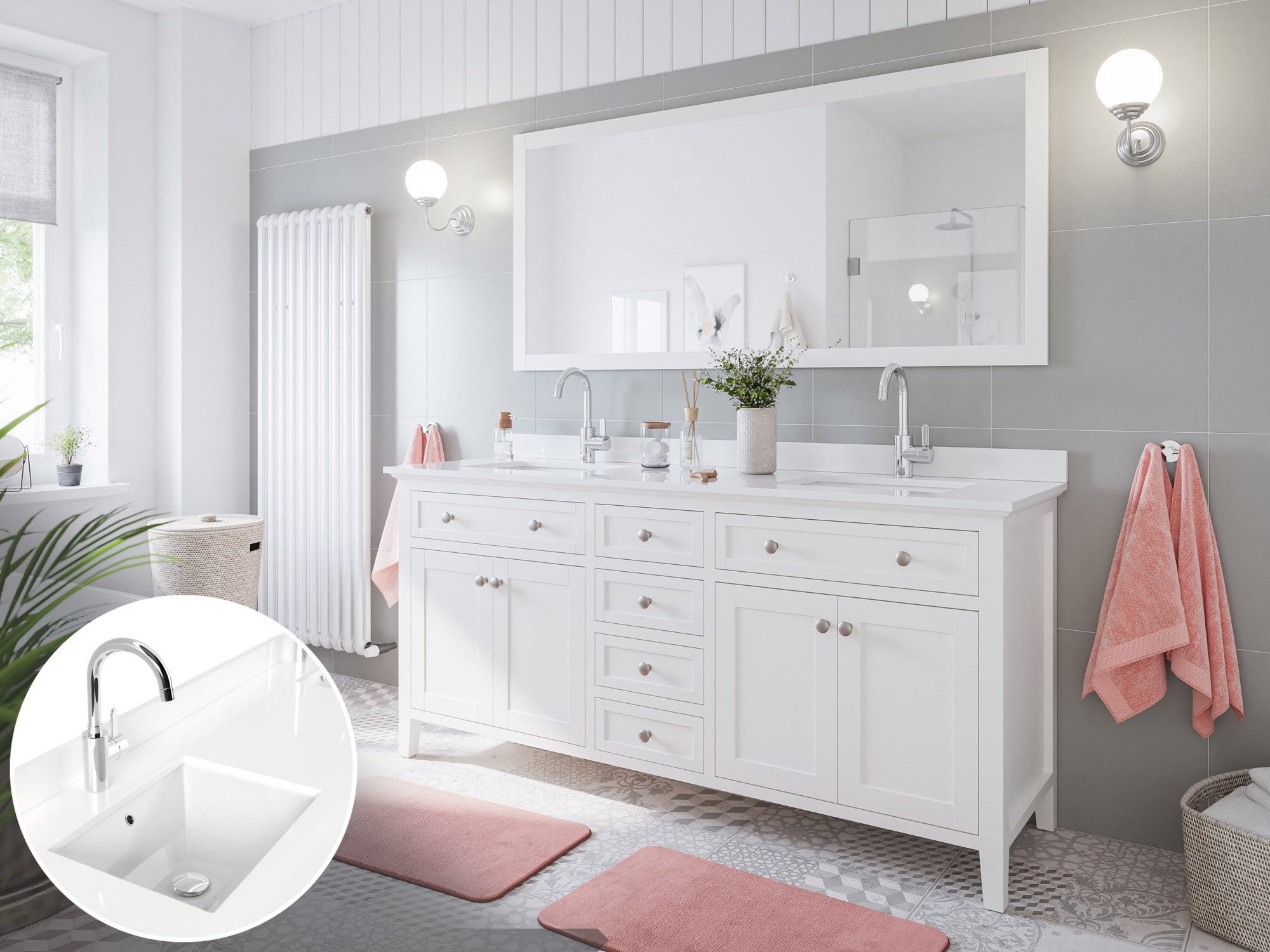 Zwei Mineralguss-Waschbecken in edlem Quarzstein-Aufsatz:Die gesamte Auflagefläche der Waschtisch-Kommode besteht aus einem Quarzstein-Gemisch und bildet eine schöne und großzügige Ablagefläche im Badezimmer für Seifen und Bad-Utenslien. Die Quarzstein-Platte ist für Armatur/en bereits mit Hahnloch / Hahnlöchern versehen. Die passende Waschbecken-Mulden bestehen aus weißem Mineralguss und werden jeweils in die Auflagefläche eingelassen.