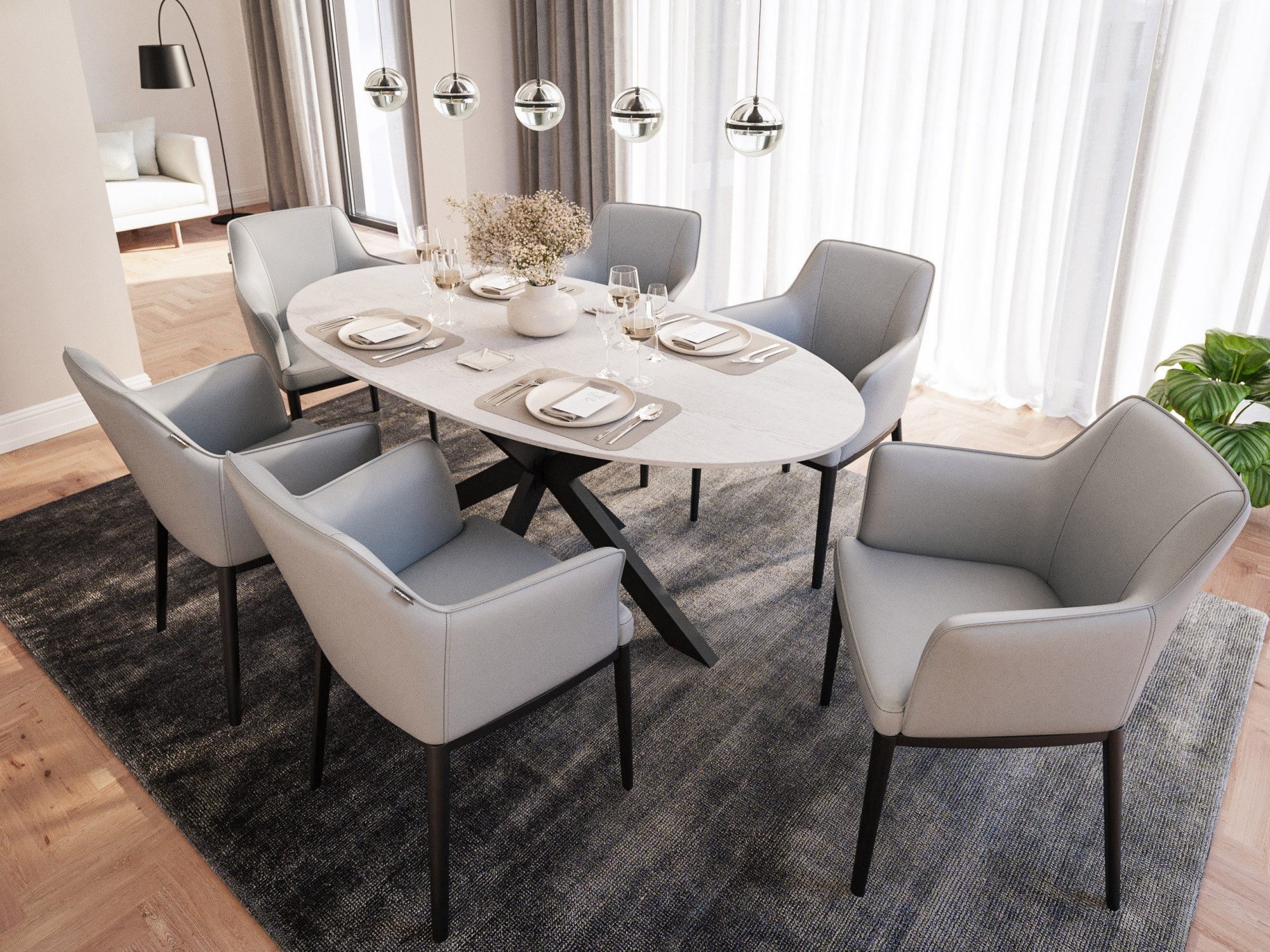 Magnolia Home Esszimmer-Set Esstisch mit 6 Stühlen Kunstleder DARON 180 Oval Eiche Furnier weiß la