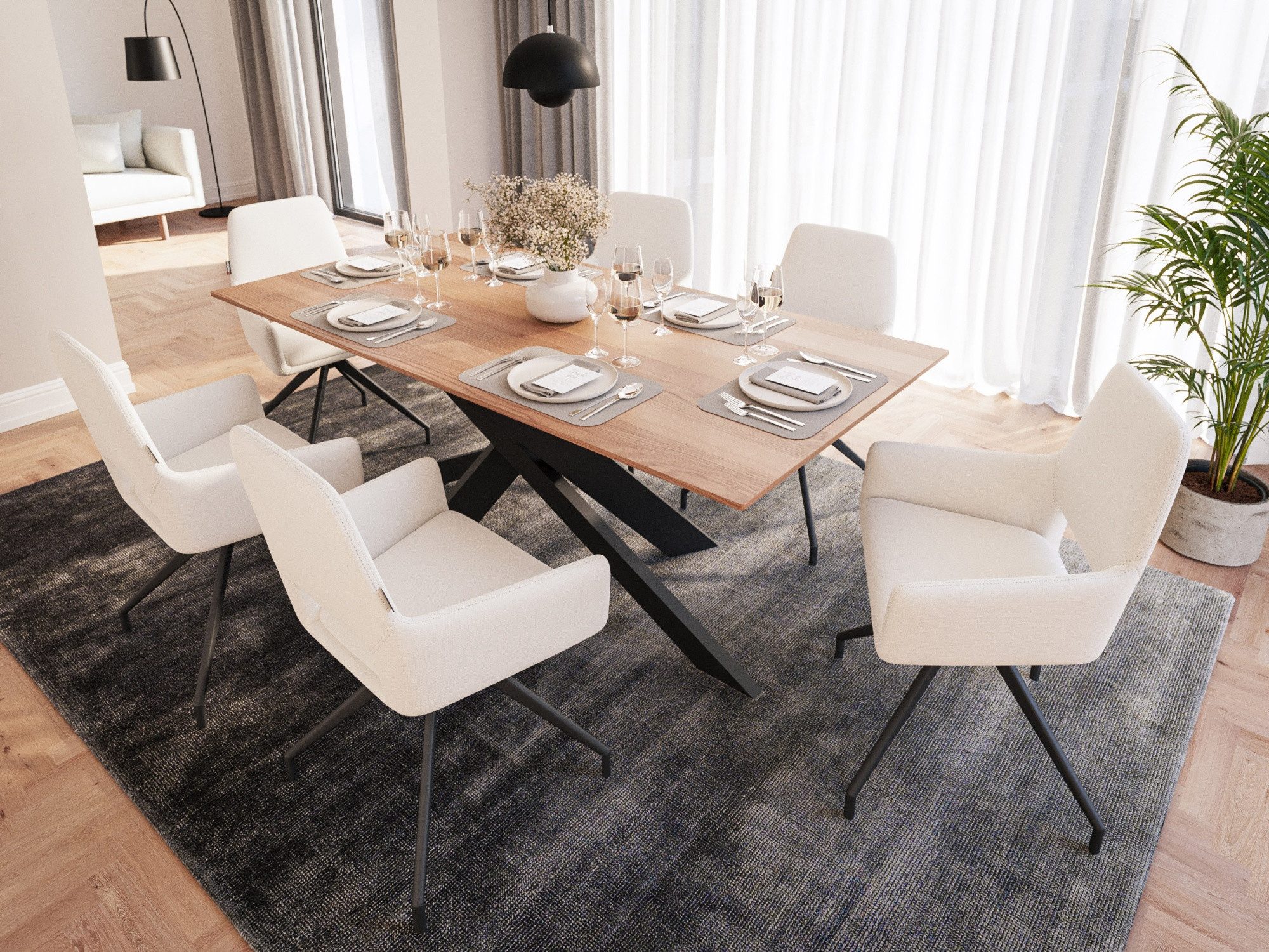 Der Esszimmerstuhl hat vier Beine, die aber nicht direkt an dem Stuhl angebracht sind. Stattdessen enden diese an einem Drehmechanismus der es erlaubt mit dem Stuhl im Sitzen sich nach rechts und links zu drehen.