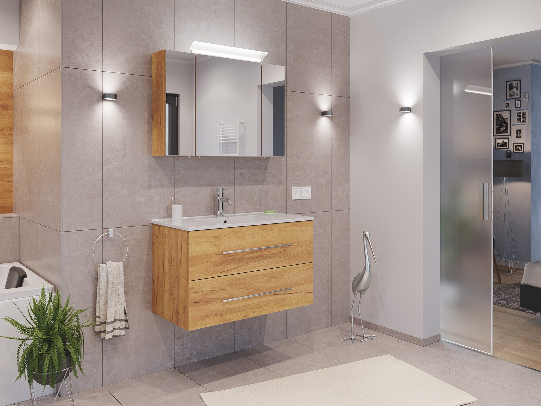 Spiegelschrank 90, inkl. Soft-Close-Türe/n mit Spiegel, 2 Regalböden aus Glas, Kombibox im Spiegelschrank mit Lichtschalter und Steckdose (B/H/T) 90/62/17 cm.