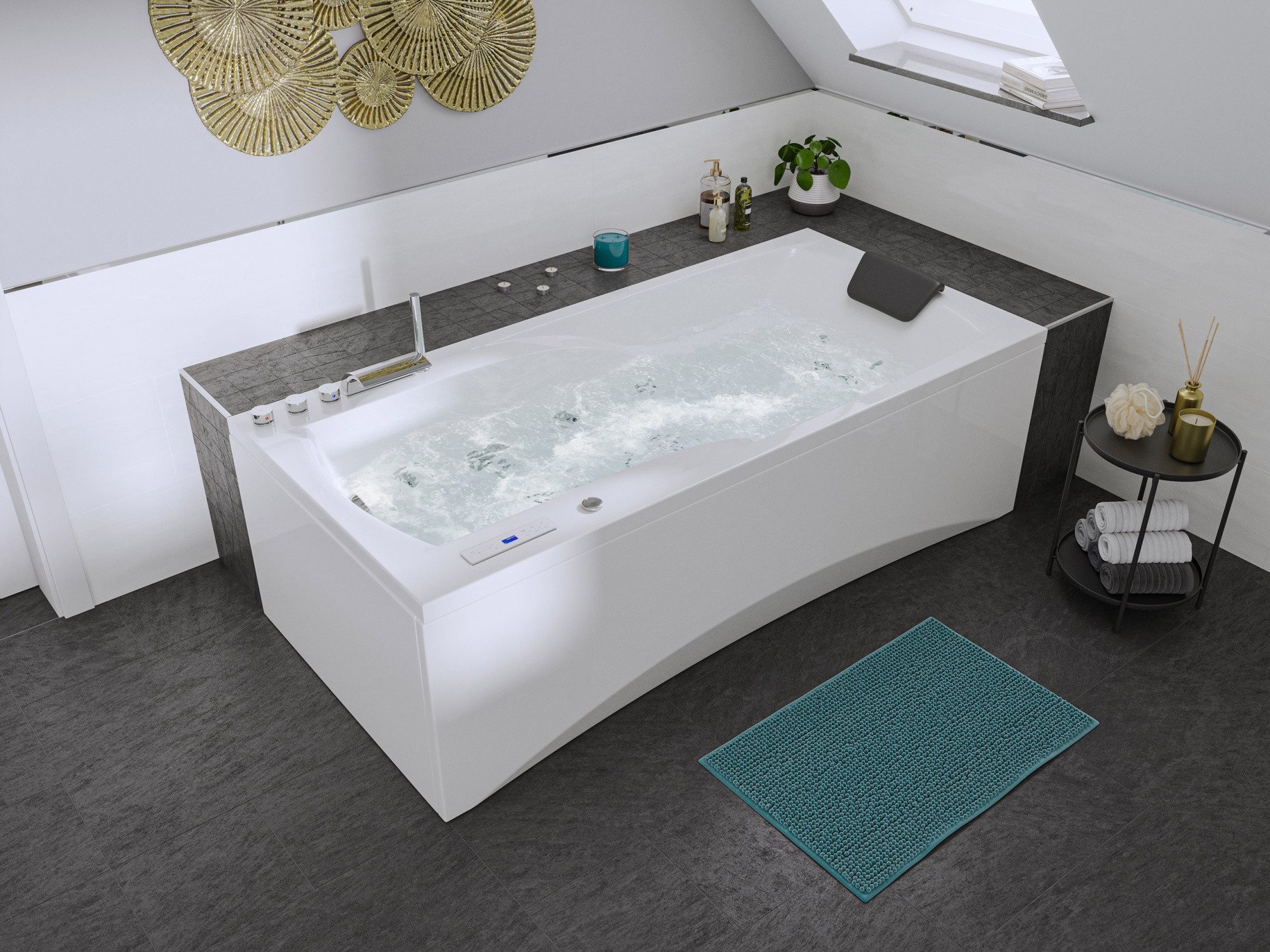 6 Stk. große Seitendüsen Hydrojets Hydromassage, 1x4 Stk. große Düsen Hydrojets Hydromassage im Rückenbereich, 8 Stk. Bodenluftdüsen Aerojets (Prickelnder Sprudel-Effekt).Material: Wanne aus Sanitäracryl auf stabilem Rahmen mit höhenverstellbaren Füßen.