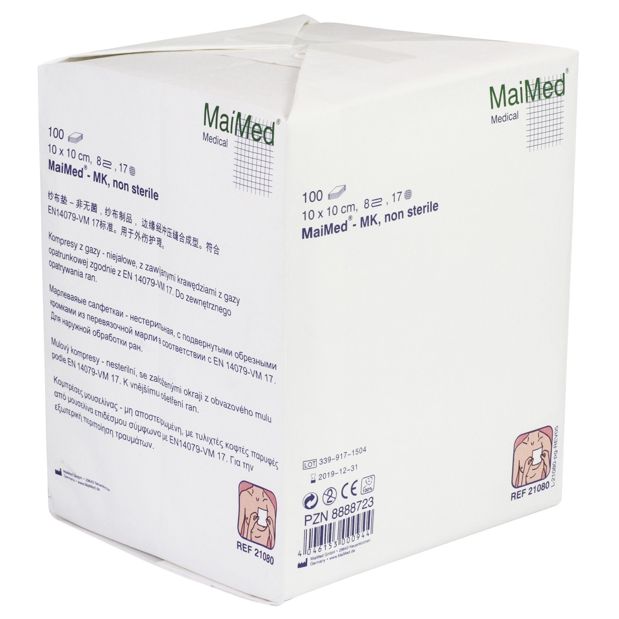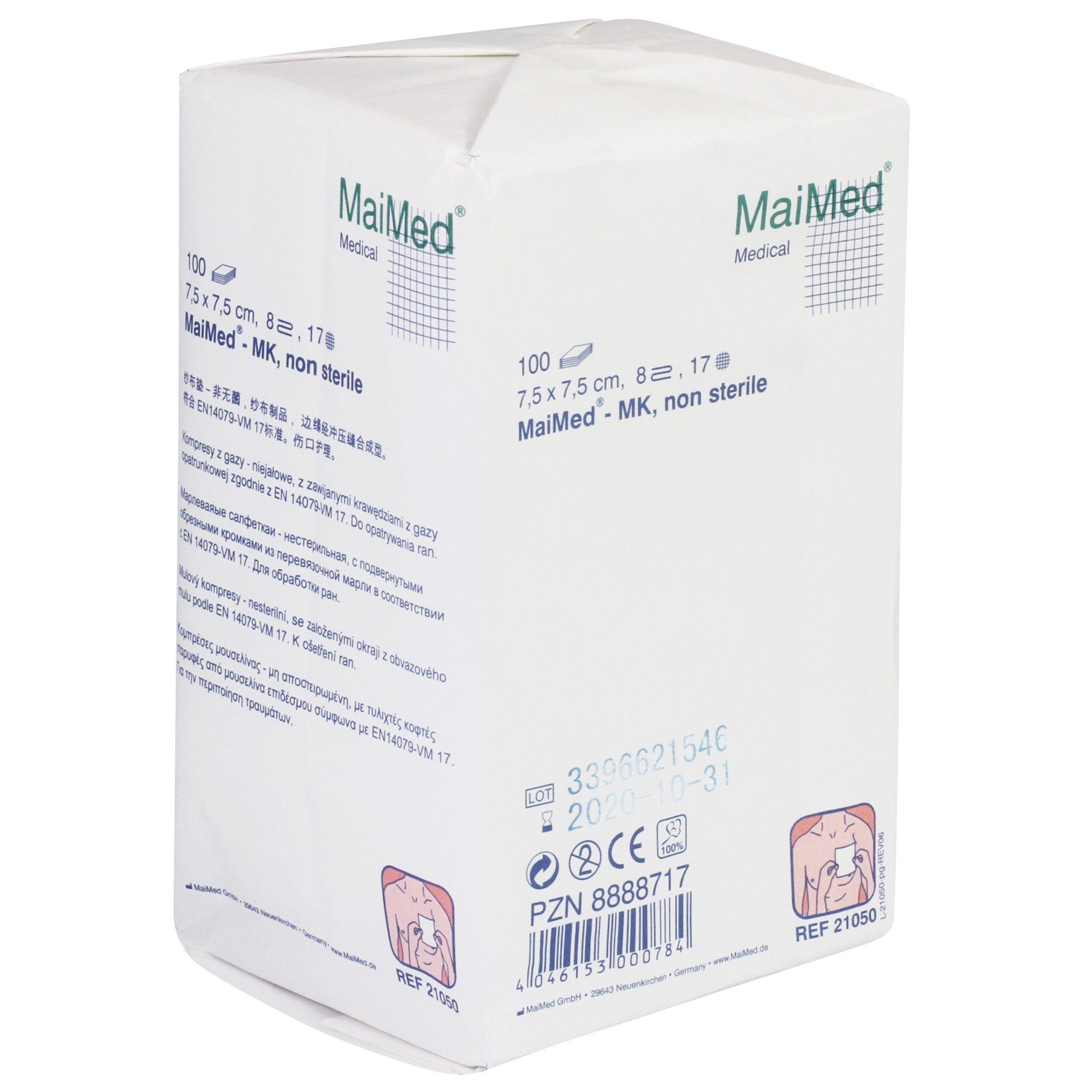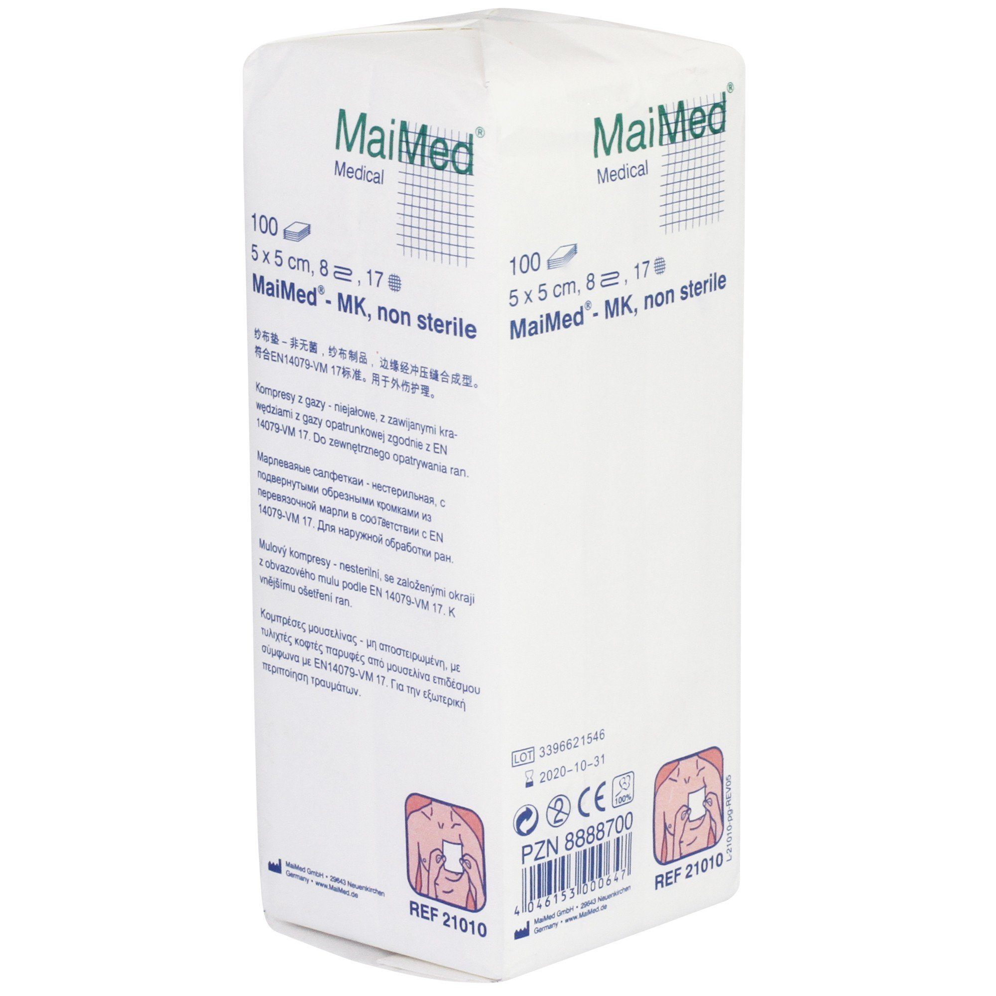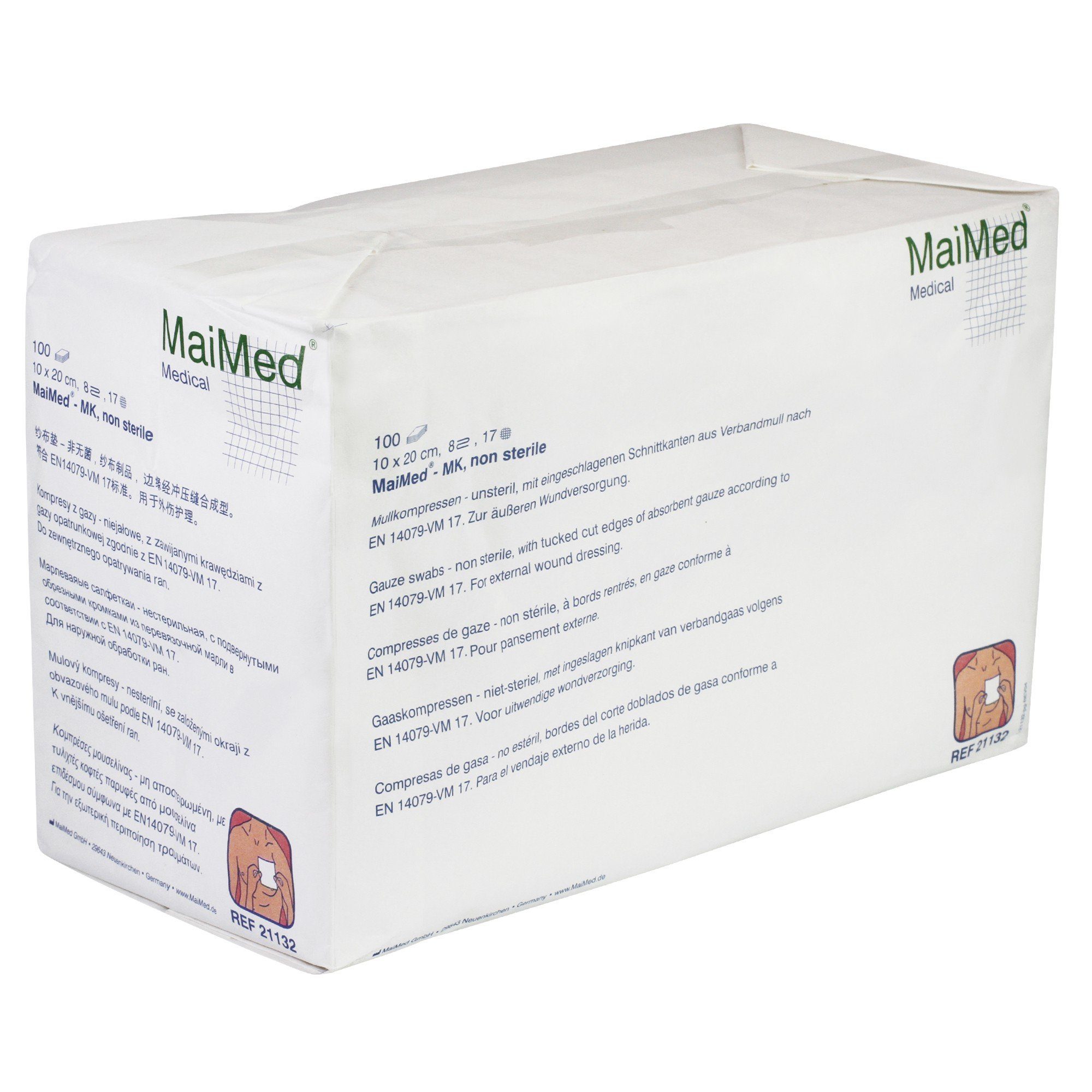 Die unsterile Mullkompresse aus Verbandmull von MaiMed verfügt über eingeschlagene Schnittkanten aus Verbandmull nach EN 14079-VM 17. Die Kompresse ist zur äußeren Wundversorgung im Ambulanzbereich, auf der Krankenstation oder zur Erstversorgung von Wunden geeignet. In jeder Packung befinden sich 100 Kompressen. Erhältlich in 4 verschiedenen Größen.
