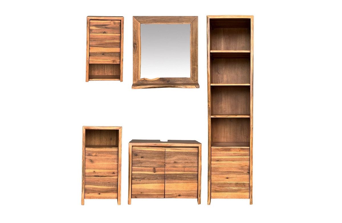 Entdecken Sie das vollständig aus massivem Akazienholz gefertigte 5-teilige Badezimmerensemble "Dakar". Akazienholz, ein nachwachsender Rohstoff, verleiht jedem Möbelstück eine zeitlose Eleganz.