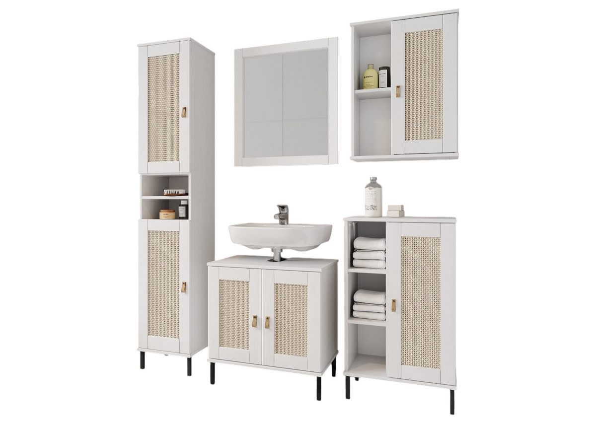 Die hochwertige Verarbeitung, die weiße Lackierung der massiven Kiefer, die Kunststoffgeflecht-Türen, die schwarzen Metallfüße und die edlen Ledergriffe zeugen von Liebe zum Detail und zeitlosem Design. Das Set wird zerlegt geliefert und ermöglicht so eine einfache und flexible Montage nach deinen individuellen Vorlieben.