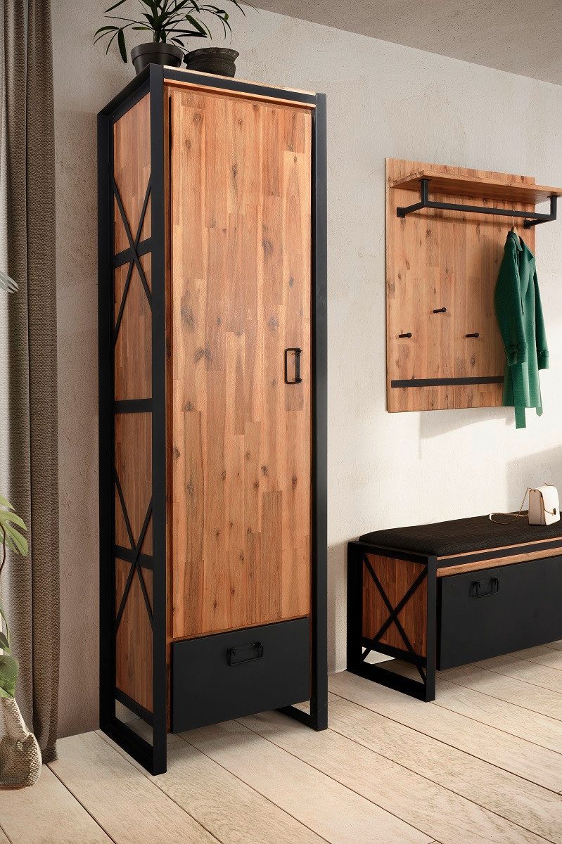 Dieser hochwertig verarbeitete Garderobenschrank ist 200 cm hoch, 57 cm breit und 45 cm tief. Das Akazienholz ist massiv und gebürstet, was ihm eine rustikale und warme Ausstrahlung verleiht. Das schwarze Metallgestell sorgt für eine moderne Note und gewährleistet gleichzeitig Stabilität und Langlebigkeit.