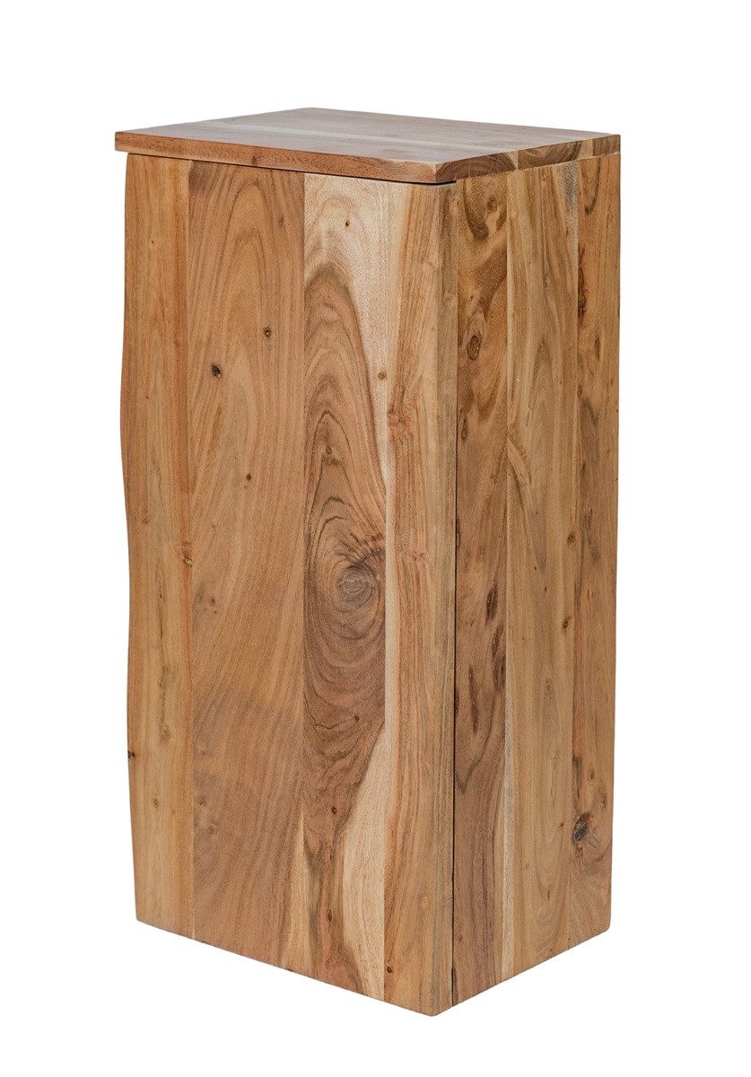 Die Türen des Schrankes sind mit einer nachempfundenen Baumkante versehen, was den natürlichen Charme des Materials unterstreicht und jedes Möbelstück zu einem Unikat macht. Hinter der Holz-Tür verbirgt sich ein praktischer Stauraum mit einem Boden, ideal, um deine Badutensilien ordentlich und griffbereit zu verstauen.