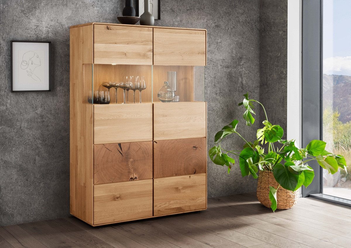 Die hochwertige Verarbeitung zeigt sich in der eleganten Optik und den durchgehenden Lamellen der Front, die aus stabilen, stabverleimten Holzstücken bestehen. Der Korpus ist parkettverleimt, was für zusätzliche Stabilität sorgt. Besondere Akzente setzt die Applikation aus Hirnholz, die dem Highboard seinen einzigartigen Charakter verleiht. Die abgerundeten Kanten runden das moderne Design harmonisch ab.