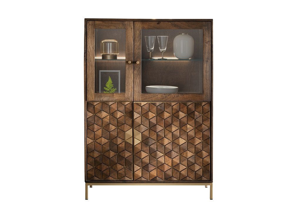Dabei wurde als Basis für dieses massive Highboard Mango Holz verwendet, dessen beruhigender und attraktiver Braunton um gleich mehrere Akzente ergänzt wurde. Einerseits sorgt ein goldenes Metallgestell für den perfekten Rahmen dieses Higboards, während andererseits die Holztüren im unteren Bereich mit einem kunstvollen Relief-Muster und goldfarbenen Applikationen kommen.