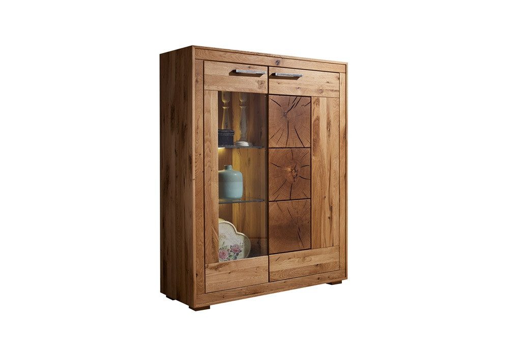 Wildeiche ist ein sehr traditionelles Material und dient wunderbar zur Herstellung von massiven Möbeln. Die Charakterstärke und der natürliche Charme des Wildeichenholzes ergeben sich durch eine bewusste Sortierung, in deren Mittelpunkt die Konservierung von markanten Rissen und Astlöchern steht. Unsere neue Serie „Danzig“ besteht aus bester geölter Wildeiche. Das Design ist modern gehalten und wirkt vor allem durch die Glaselemente an den Möbelstücken und metallenen Griffen sehr edel. Hirnholzelemente an den Fronten der Möbel sorgen für das gewisse Etwas! Все Artikel bis auf die Regale, Couchtische und Esstische erhalten Sie komplett montiert geliefert.