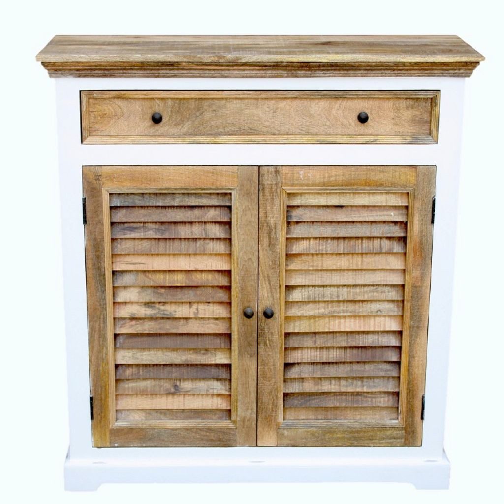 Die Kommode aus der Serie Nizza passt überall hinein. Egal ob im Eingangsbereich, Wohn- oder Essbereich. Diese Kommode ist ein Allrounder da sie Unmengen an Platz und Stauraum bietet. Die Korpusteile sind weiß lackiert. Die Ablagefläche, der Schubkasten und die Holztüren sind naturbelassen und zeigen die wunderschöne Struktur des Mangoholzes. Hinter den beiden Lamellentüren, die an manches Fenster einer verträumten französischen Altstadt erinnern, befindet sich genügend Stauraum dank der beiden Einlegeböden. Die Maße sind 111cm Höhe, 40cm Tiefe und 109cm Breite.