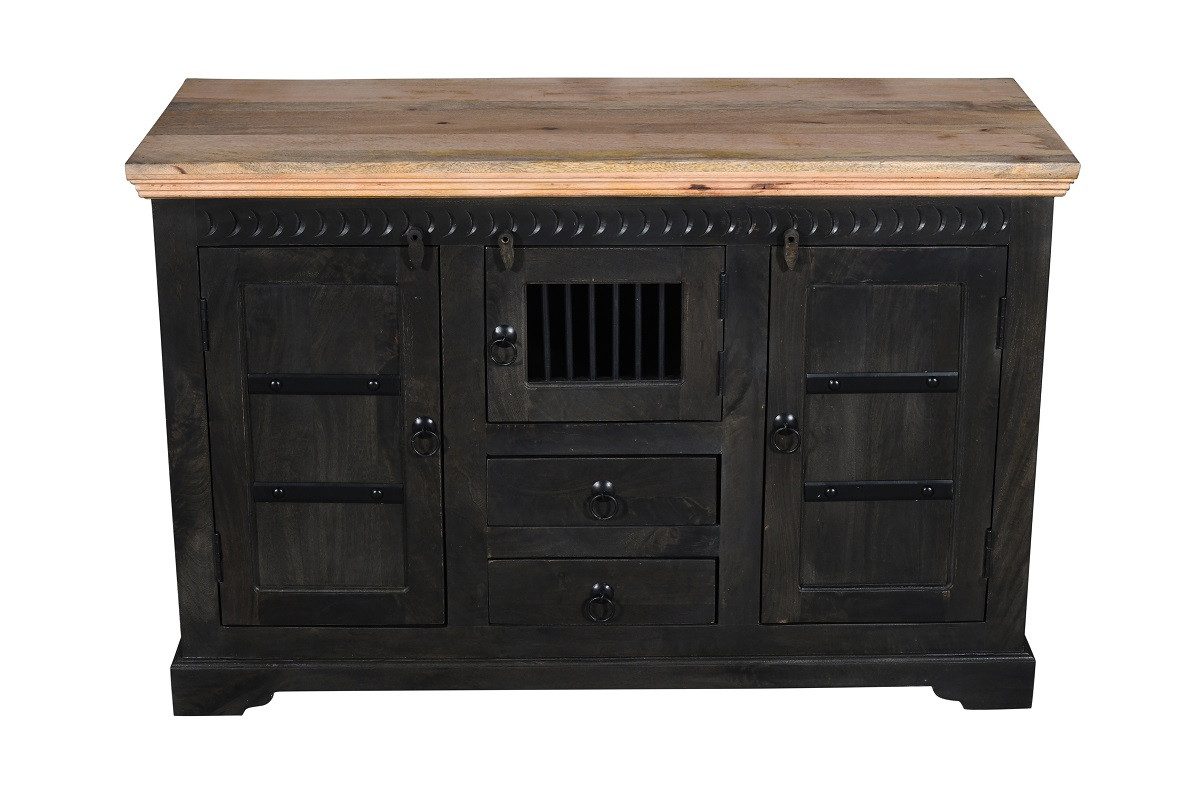 Mit einer Breite von 130 cm, einer Höhe von 85 cm und einer Tiefe von 50 cm bietet das Sideboard großzügigen Stauraum. Der Deckelboden aus natur lackiertem massivem Mangoholz bildet einen harmonischen Kontrast zum schwarz lackierten Korpus. Die beiden Türen mit eleganten schwarzen Metallapplikationen und den markanten Ringgriffen aus antikem Schwarz verleihen dem Sideboard eine zeitlose Ästhetik.