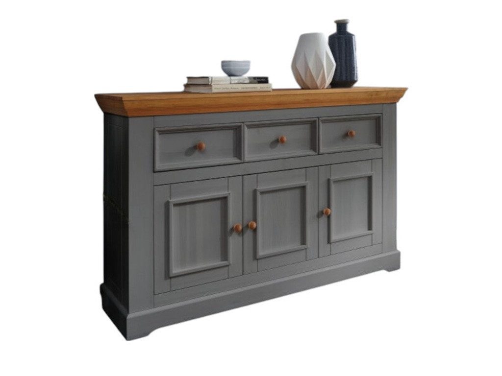Grau lasierte Kiefer mit einer eichefarbig lackierten Deckplatte machen dieses Wohlfühlmöbel zu etwas ganz besonderem. Dieses Design ist schlicht und doch mit einer gewissen Eleganz verbunden. Das Stauraumangebot sucht seinesgleichen. Und die farbigen Absetzungen bieten einen tollen Kontrast zu dem puristischem Weiß.