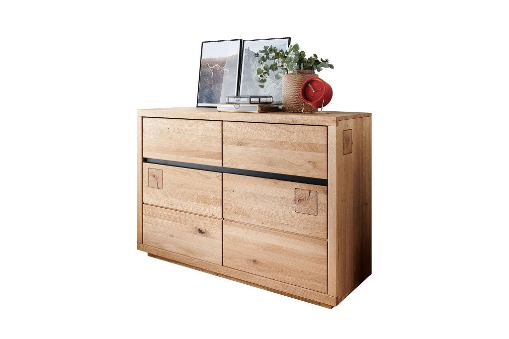 Dieses Sideboard aus der Serie "Bergamo"wurde aus massiver Wildeiche gefertigt. Es ist ein außergewöhnliches Stück Natur für Ihre vier Wände. Eine Verbindung aus elegantem Design mit der Ursprünglichkeit des Holzes. Gradlinig und modern im Design, strahlt das Sideboard dennoch angenehme Wärme aus. Die außergewöhnliche Maserung und Struktur des Holzes kommt wunderschön zur Geltung und verleiht dem Möbel ihren eigenen Charme. Durch die zwei Schubkästen und 2 Holztüren hinter welchen sich jeweils ein Einlegeboden befindet, erhälst Du jede Menge Stauraum. Die in schwarz gehaltenen Aplikationen und die eingearbeiteten Hirnholzelmente sind das optische Highlight und unterstreichen die Schönheit dieses Massivholzmöbelstückes.