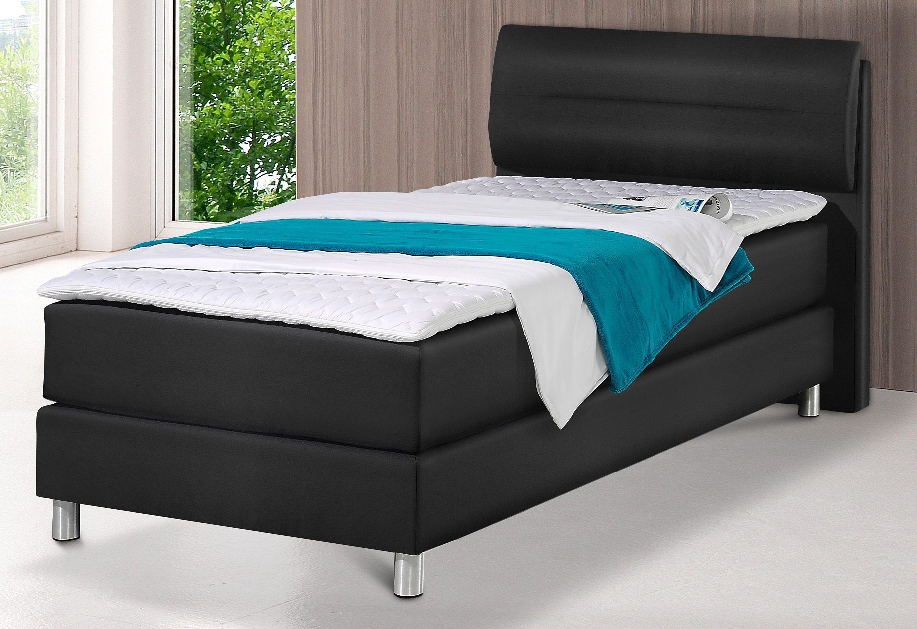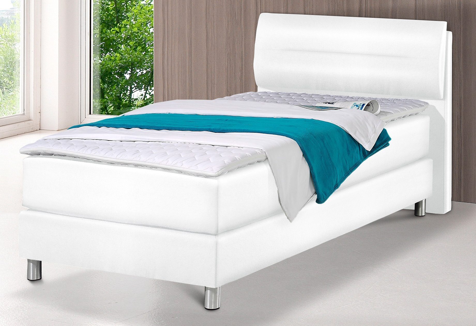 Wissenswertes | Boxspringbett inkl. Kaltschaum-Topper und verstellbaren Kopfteilen. Bei Boxspringbetten wird kein Lattenrost und Bettrahmen verwendet. Durch den speziellen Aufbau aus einem Unterbau mit Boxspring-Unterfederung mit Bonnell-Federkern und darüber liegenden losen Matratzen liegen Sie ergonomisch korrekt. Das gesamte Liegesystem passt sich perfekt an. In 5 Farben, 4 Breiten und 6 Ausführungen. Bezug Strukturstoff aus 100% Polyester bzw. Kunstleder (Weiß und Schwarz). Kopfteil 10 cm dick mit aufgesetzten, verstellbaren Kopfteilelementen (ab Размер 140 cm zweigeteilt). Kopfteilhöhe 100 cm. Aluminiumfarbige Metallfüße. Bodenfreiheit 9 cm. Komfort-Liegehöhe 55 cm inkl. Kaltschaum-Topper. Topper 5 cm hoch. Bezug gesteppt aus 100% Polyester, bei 60°C Grad waschbar. Massives Holzgrundgestell mit Bonnell-Federkern, der mittig mit Matratzenspiegel versehen ist. Das Untergestell ist zweigeteilt und seitlich mit Strukturstoff bzw. Kunstleder bezogen. Ohne Bettwaren. Details: