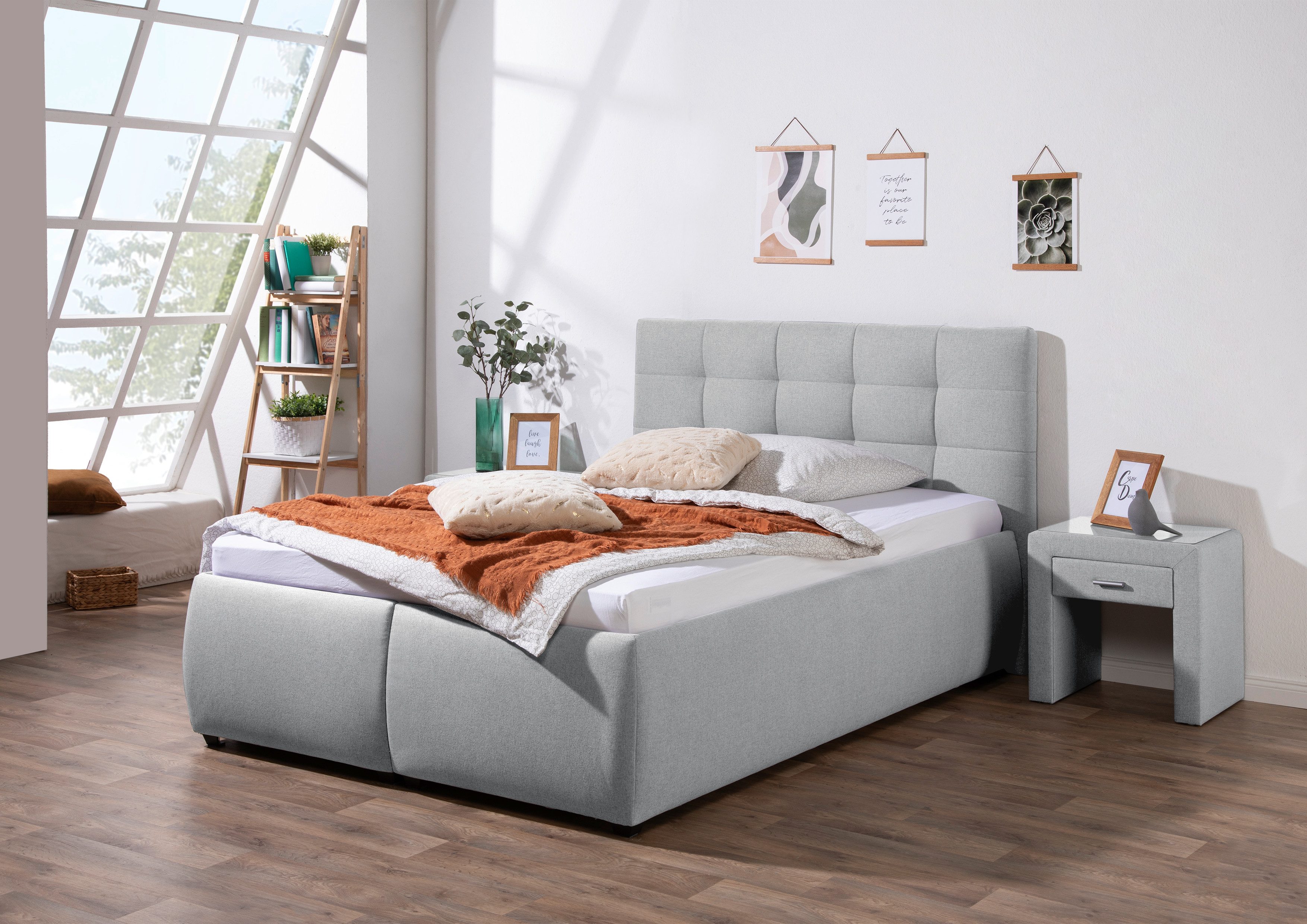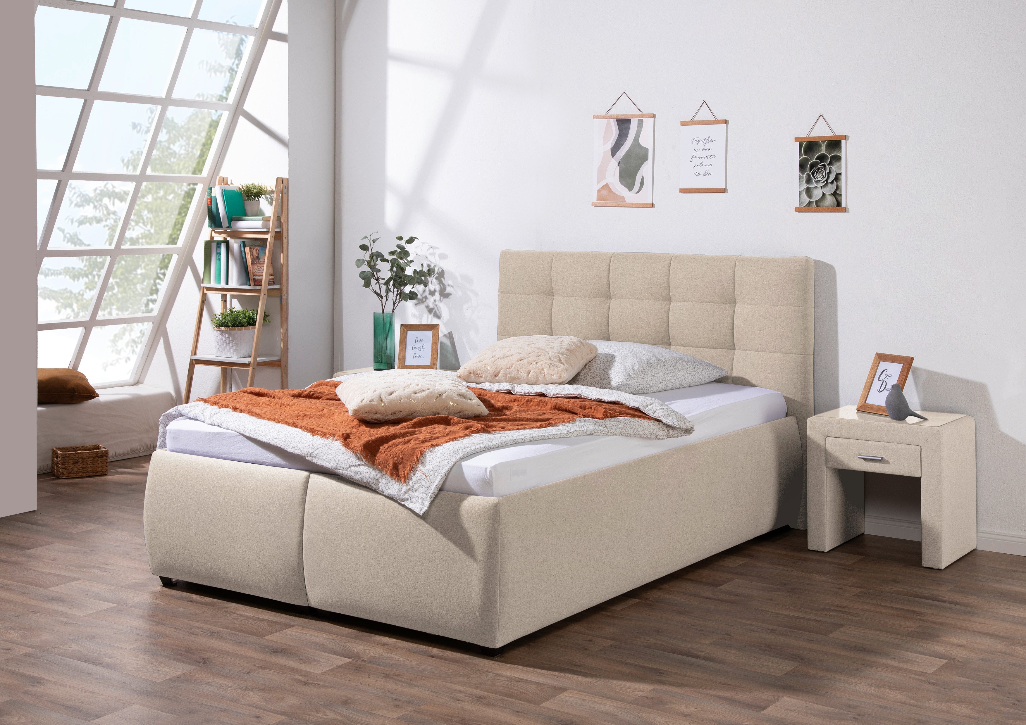 Einrichtungstipp gefällig? Farben wie Weiß, Créme und Beige komplettieren den skandinavischen Einrichtungsstil des Polsterbetts und sorgen für ein unbeschwertes Ambiente. Grüne Zimmerpflanzen und Accessoires in Gelb oder Türkis können dabei farbliche Akzente in den Raum bringen. Dazu passen zum Beispiel eine Kommode aus Massivholz und elegante Deko-Elemente mit edler Note.