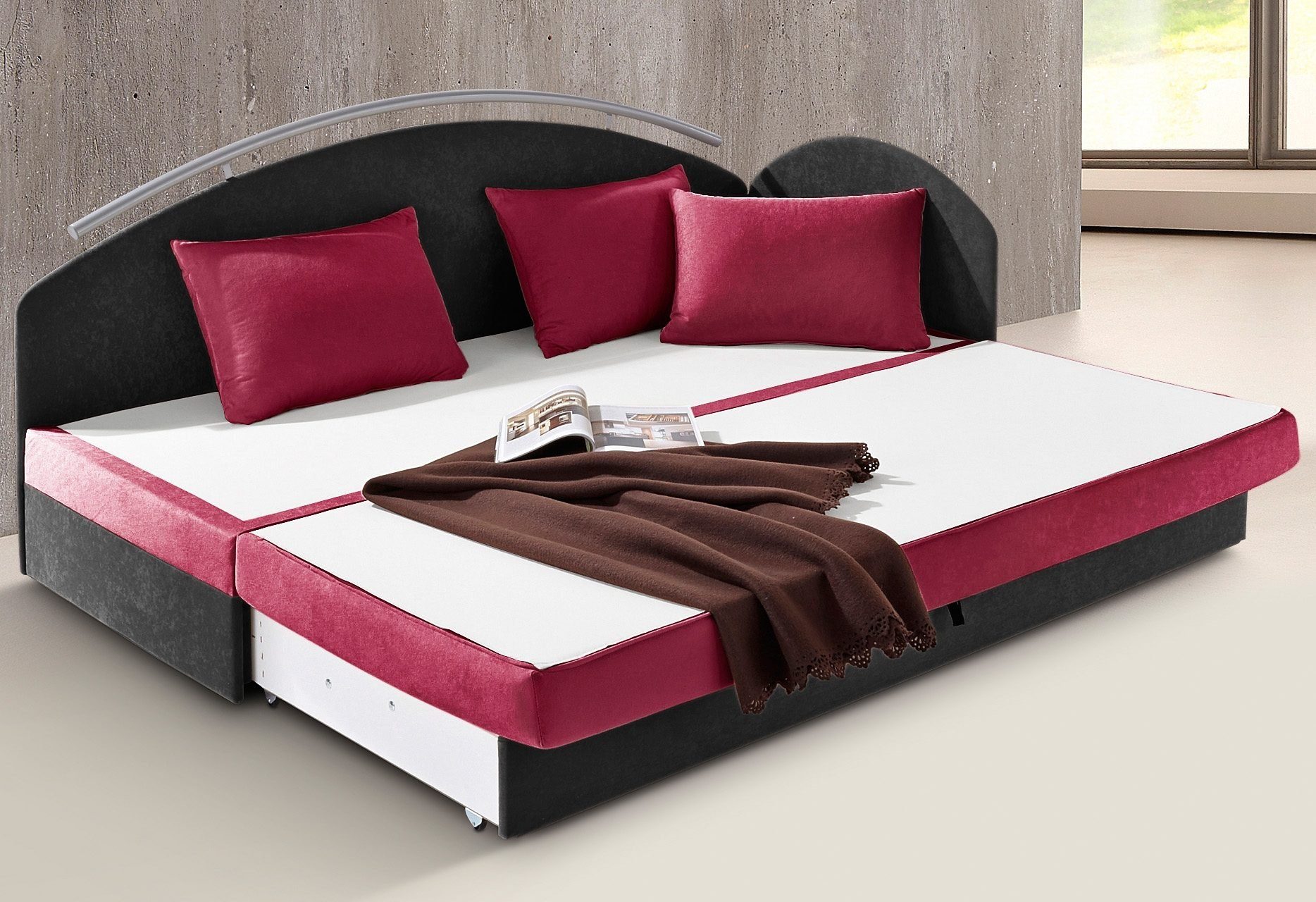 Wissenswertes | Entspricht ca. Härtegrad 2 Mit Seitenteil und Metall-Reling am Rückenteil. Seiten- und Rückenteil sowie Metall-Reling gerundet. Das Seitenteil ist wahlweise rechts oder links montierbar. Bezogen mit pflegeleichter Microfaser (100% Polyester). Mit Schlaffunktion mit Polyätherschaummatratze. Liegefläche: Vollschaum. Entspricht ca. Härtegrad 2. Bettkasten mit Klappe, auf den ausgezogenen Bettkasten wird die Doppelmatratze aufgelegt. Liegehöhe 40 cm, ausgeklappt 30 cm. Liegefläche 80/193 cm, ausgeklappt: 158/193 cm, Außenmaße 84/198 cm. Seitenteilhöhe ca. 70 cm, Rückenteilhöhe ca. 84 cm. Gepolstert mit Polsterwatte aus 100% Polyester, Unter- und Rückseite Spannstoff aus 100% Polyester. Ohne Kissen. Всеs ca.-Maße. Mit Aufbauanleitung. |