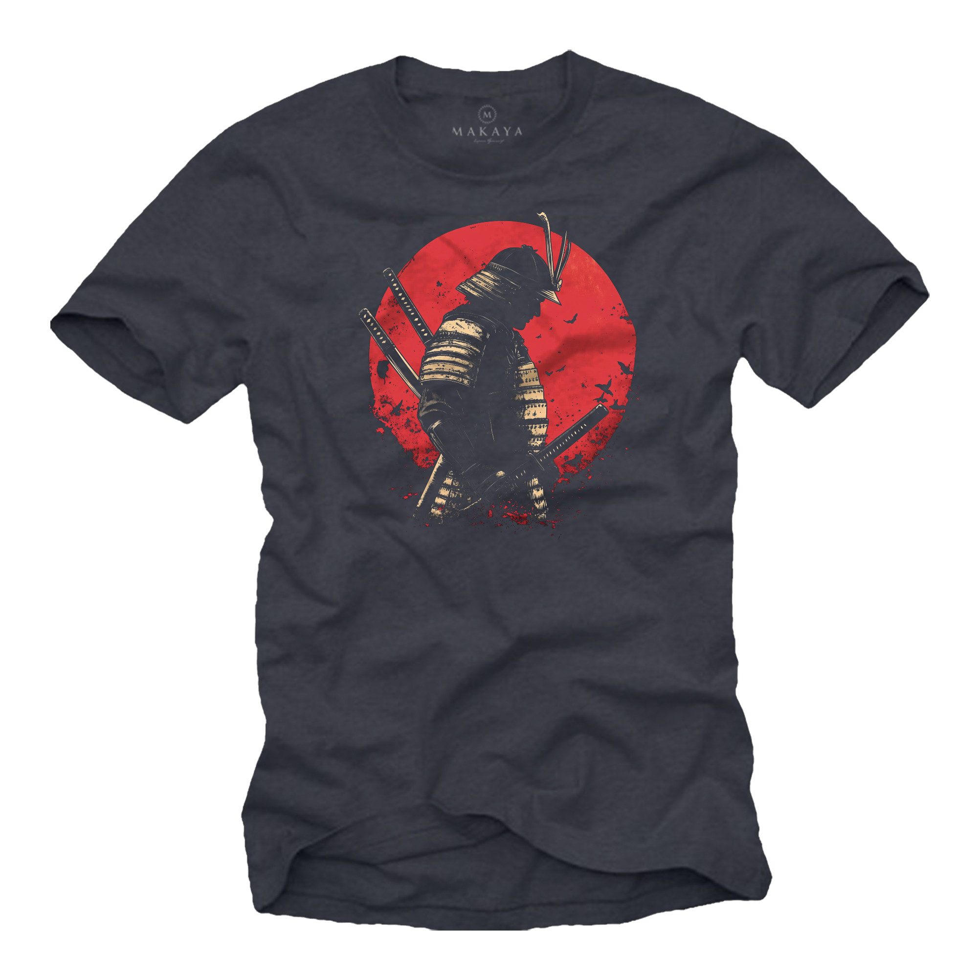 MAKAYA Print-Shirt Japan Style Samurai Design Anime Motiv Dragon Krieger (Schwarz, Blau, Blaugrau, Grün, S, M, L, XL, XXL, 3XL, 4XL, 5XL) Baumwolle