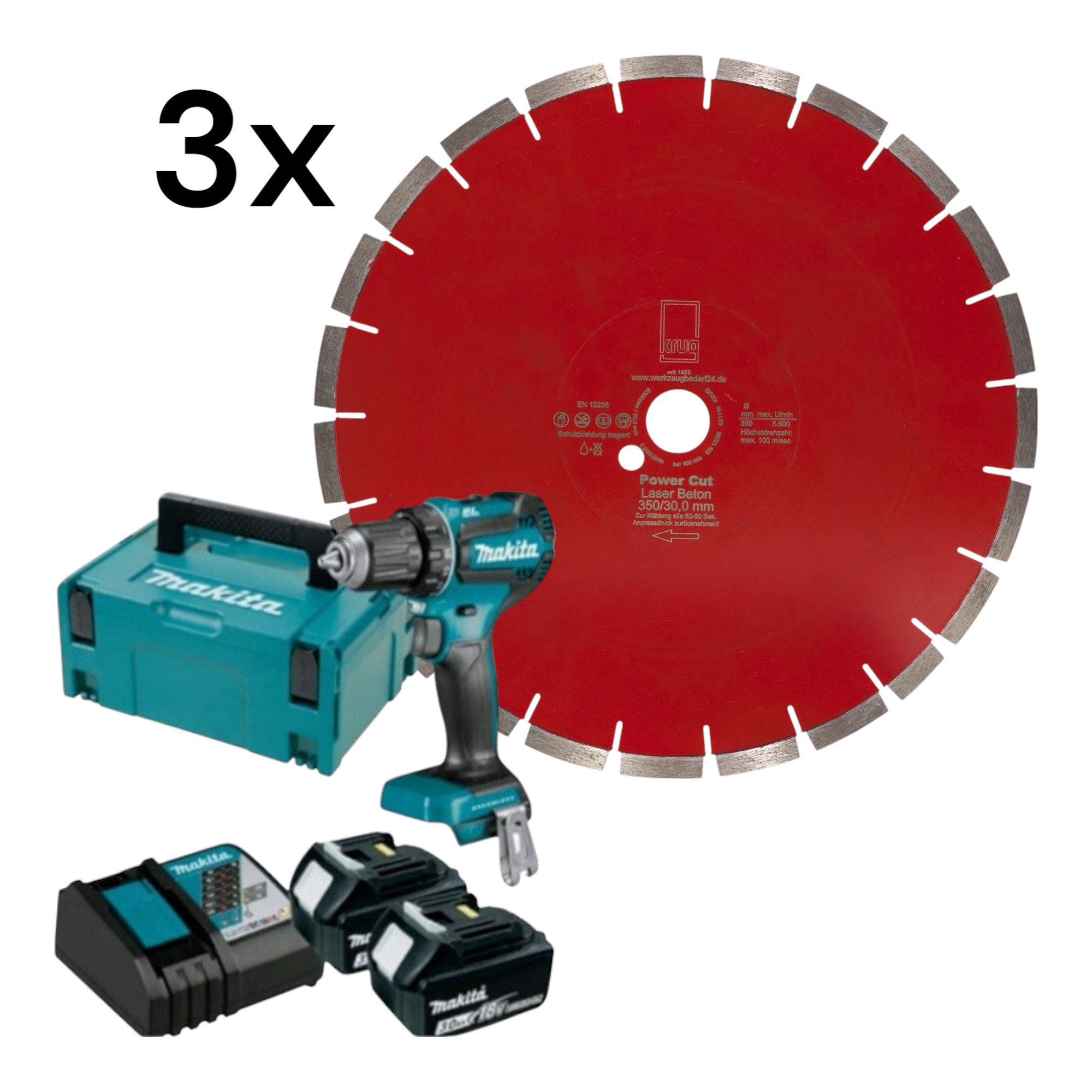 Makita Akku-Bohrmaschine Set 3xPower Cut Beton Laser 350/30 mm+ Makita DDF485RFJ2 2 x 3,0Ah + S