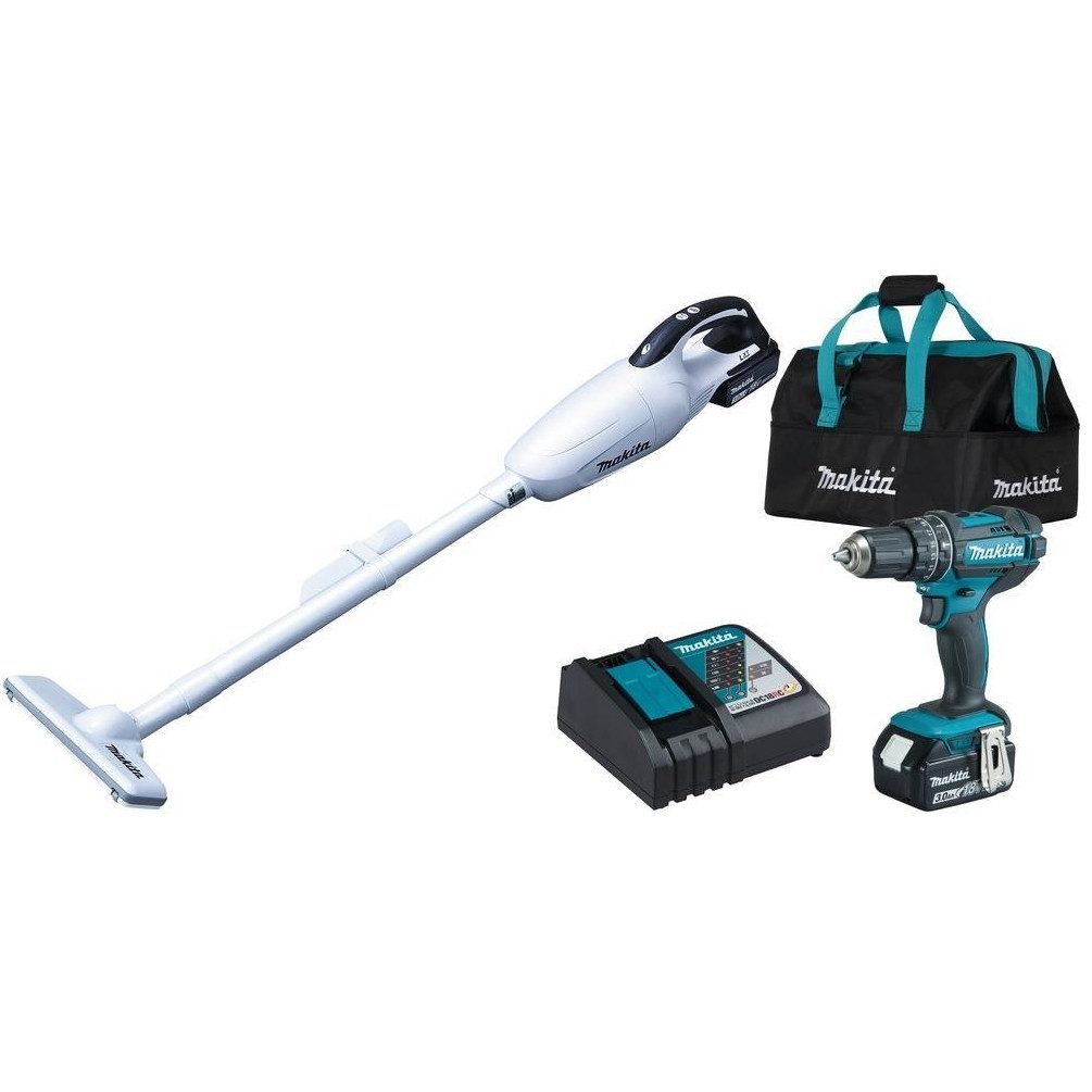 Set beinhaltet | - DHP482Z Akku-Schlagbohrschrauber - DCL181FZW Akku-Staubsauger - 2 x Akku BL1830B - Ladegerät DC18RC - Makita Transporttasche |