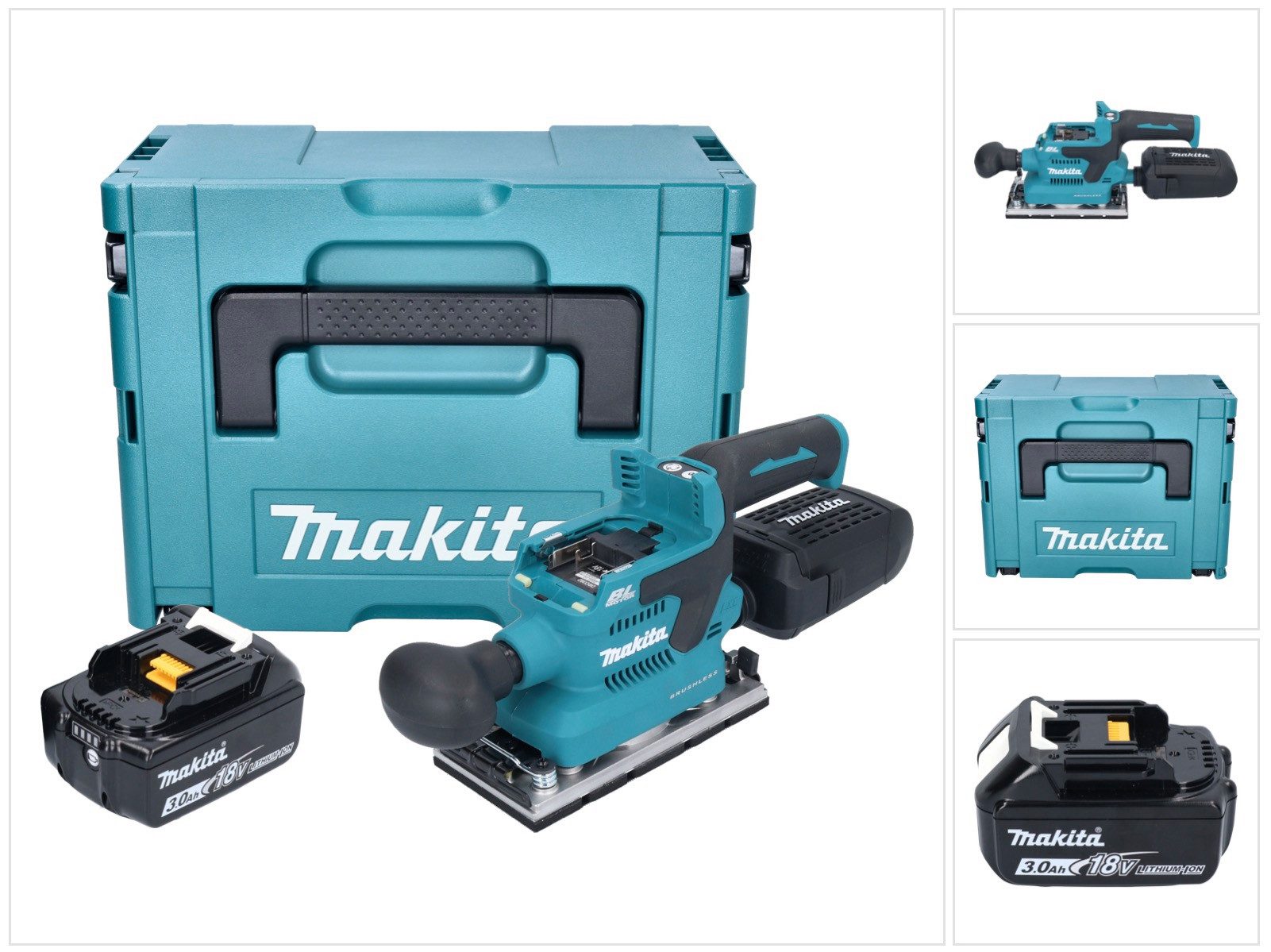 Der DBO 382 von Makita ist ein Leistungsstarker Akku-Schwingschleifer für eine Vielzahl von Anwendungen. Durch die 93 x 185 mm große Grundplatte ist er zum Schleifen von großen Flächen perfekt geeignet. Alternativ kann auch Schleifpapier in der Abmessung von 93 x 185 mm per Klett-Verschluss angebracht werden. Aufgrund der drei einstellbaren Drehzahlstufen sind gleichmäßige Oberflächenbearbeitungen von Holz, Metall oder Kunststoff möglich. Der gummierte Handgriff sorgt für einen sicheren Halt. Die spezielle Anordnung des Akkus sorgt für ein perfektes Gleichgewicht der Maschine. Der Schleifstaub lässt sich sowohl mit der mitgelieferten Staubfangbox oder mit einer externen Staubabsaugung auffangen. Dank der gelöcherten Grundplatte wird eine sehr effektive Absaugung ermöglicht. Makita ist ein führender Hersteller von Elektrowerkzeugen, der sich vor allem durch seine lange Tradition und hohe Verarbeitungsqualität auszeichnet.