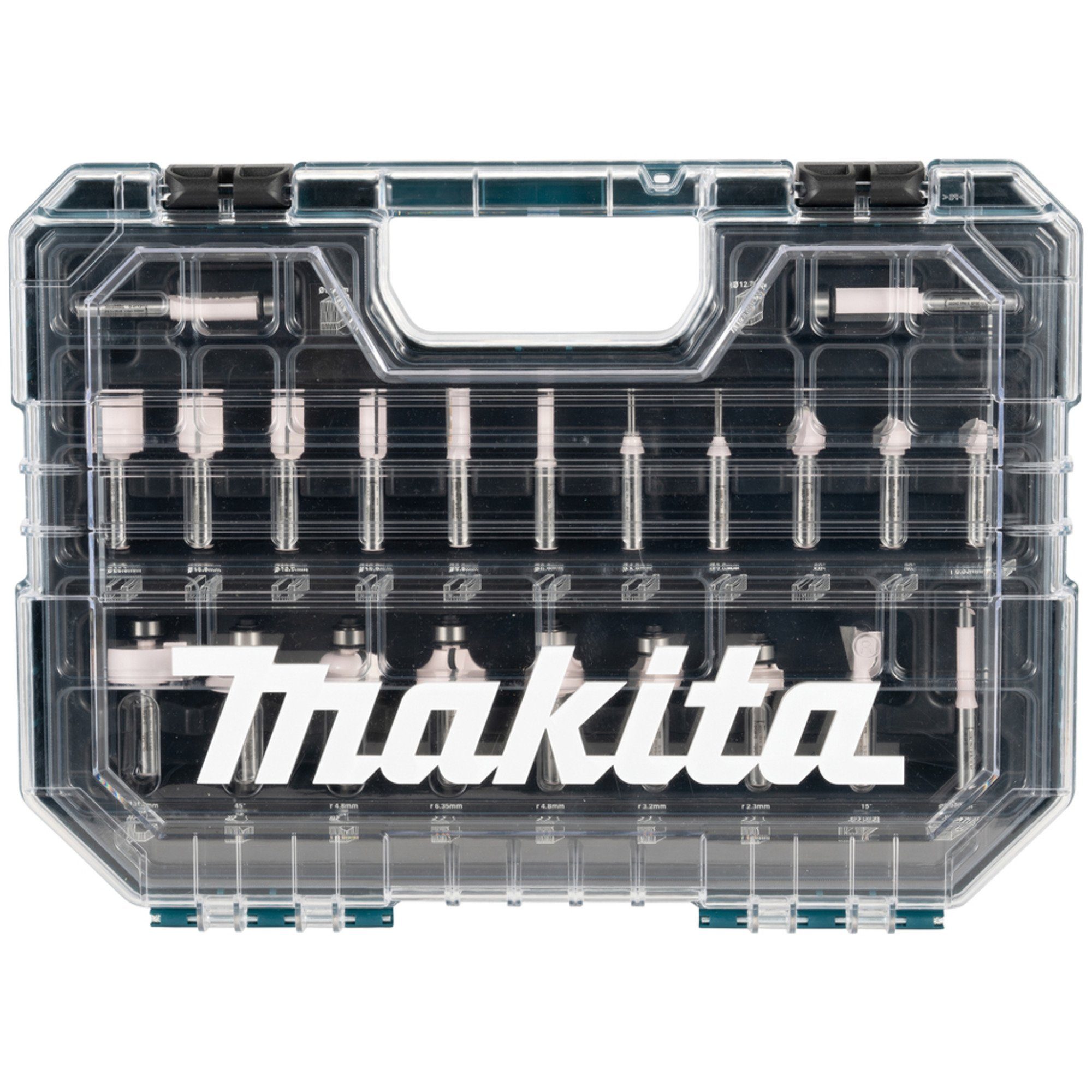 8mm Schaft Das 22-teilige Fräser-Set D-74778 von Makita wird in einem Transportkoffer (ca. 250 x 345mm) mit transparentem Deckel geliefert. Die Fräser haben einen Schaft-Durchmesser von 8mm und eignen sich zum Fräsen verschiedener Formen in Holz, in der Möbelfabrik, beim Schreiner und beim Heimwerker. Das Fräser-Set D-74778 enthält acht Nutfräser, einen Hohlkehlfräser, zwei V-Nut Fräser, einen Zinken- und Gratfräser und einen Bohrfräser mit Führung ohne Anlauflager sowie vier Abrundfräser, einen Fasefräser, einen Hohlkehlfräser, zwei Bündigfräser und einen Fugenhobelfräser mit Anlauflager.