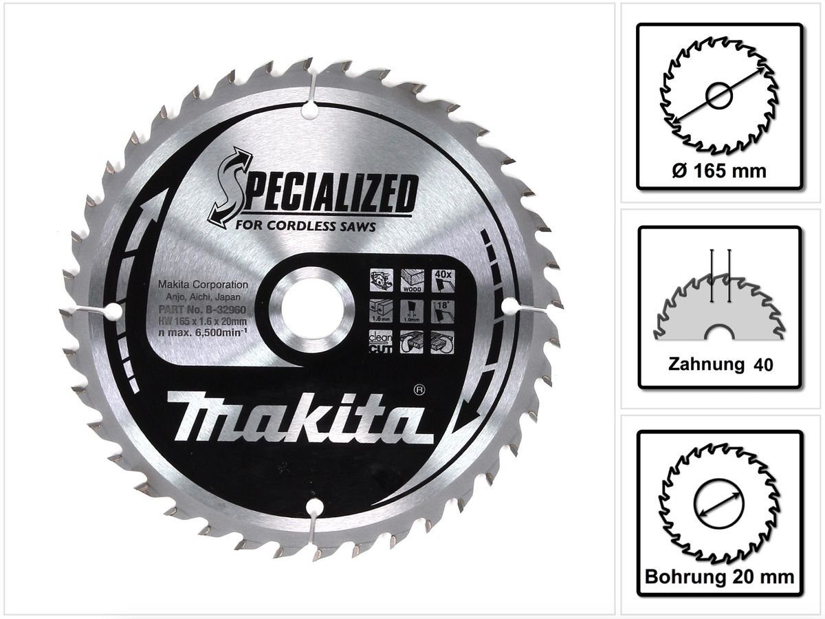 - 1x Makita SPECIALIZED Kreissägeblatt 165 x 1,6 x 20 mm 40 Zähne ( B-32960 )