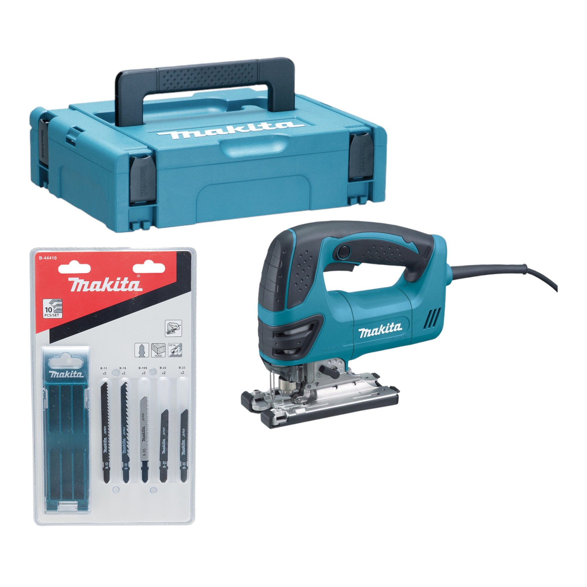Die Makita 4350 FCT ist eine kraftvolle und schnelle, 720 Watt starke Pendelhubstichsäge mit einer elektronisch einstellbaren Hubzahl sowie einem sehr leisen und vibrationsarmen Lauf. Des Впередen verfügt die Makita 4350 FCT über eine Grundplatte aus Aluminium-Druckguss, welche beidseitig um 45° schwenkbar ist und einen integrierten Staubsaugeranschluss für eine effektive Fremdabsaugung besitzt. Eine Vierkant-Hubstange vermindert das Verkanten bei Kurvenschnitten. Mit dem Schnellspannbügel lässt das Sägeblatt ohne Werkzeug wechseln und mit der leuchtstarken LED wird der Arbeitsbereich optimal ausgeleuchtet.