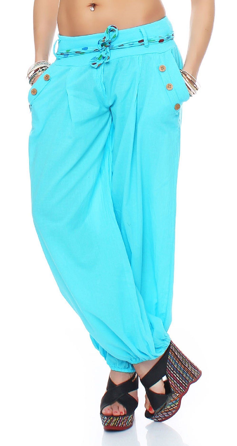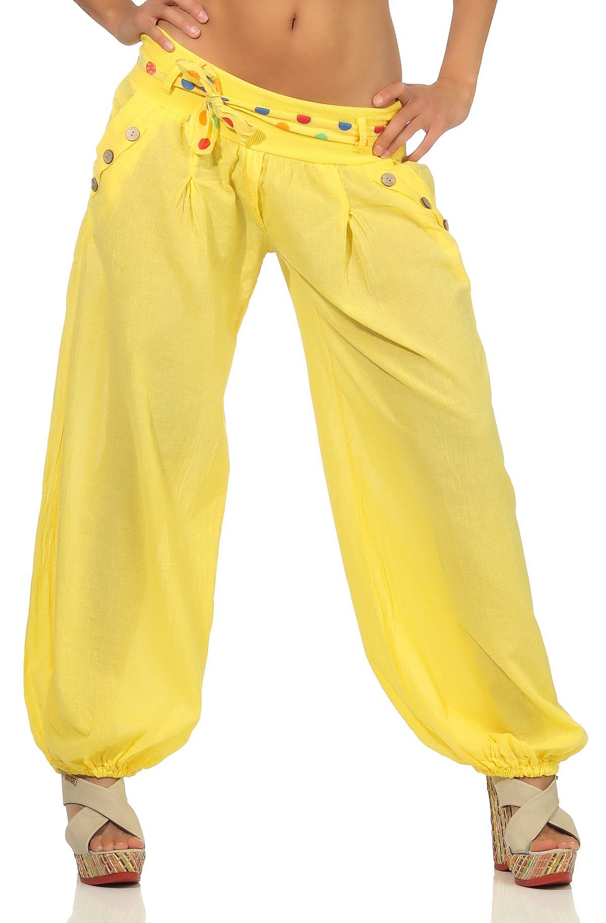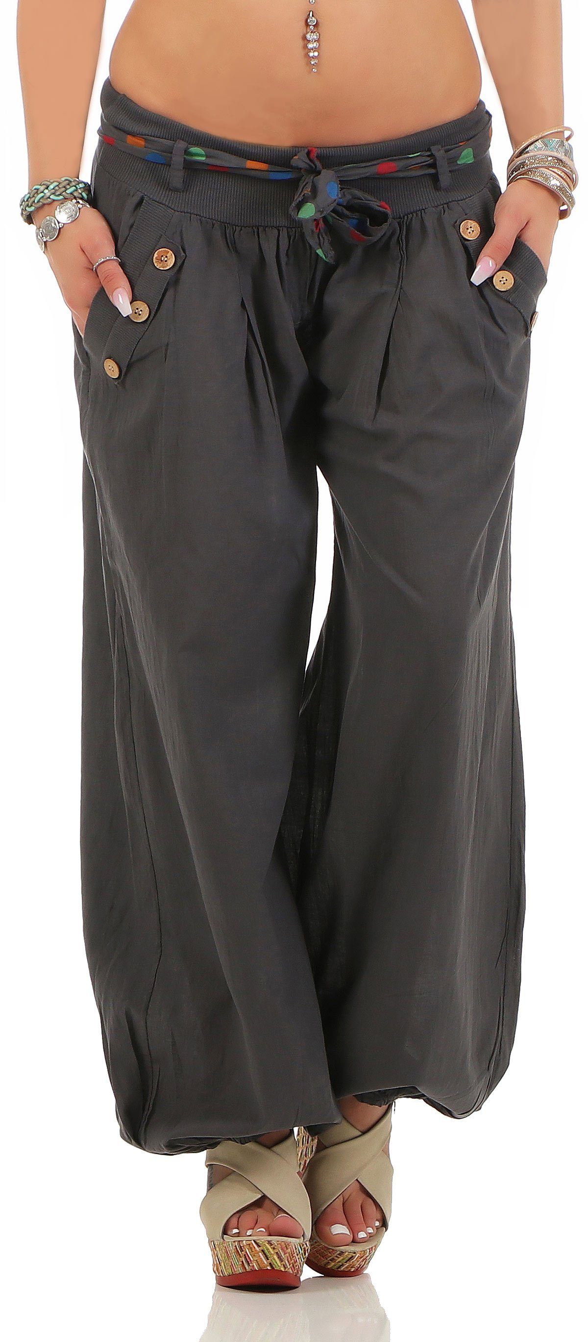 Besonderheiten: Die Stoffhose besteht aus feiner Qualität und ist mit breitem Hosenbund ausgestattet, der einen Stoffgürtel inkludiert. Zudem sind an den Beinabschlüssen Gummibündchen angebracht, um einen optimalen Sitz zu gewährleisten. An den Seiten verfügt die Hose über zwei Eingriffstaschen mit Knopfverzierung für einen edlen Look. Mit dieser sommerlichen Hose wird jedes Outfit zum Highlight.