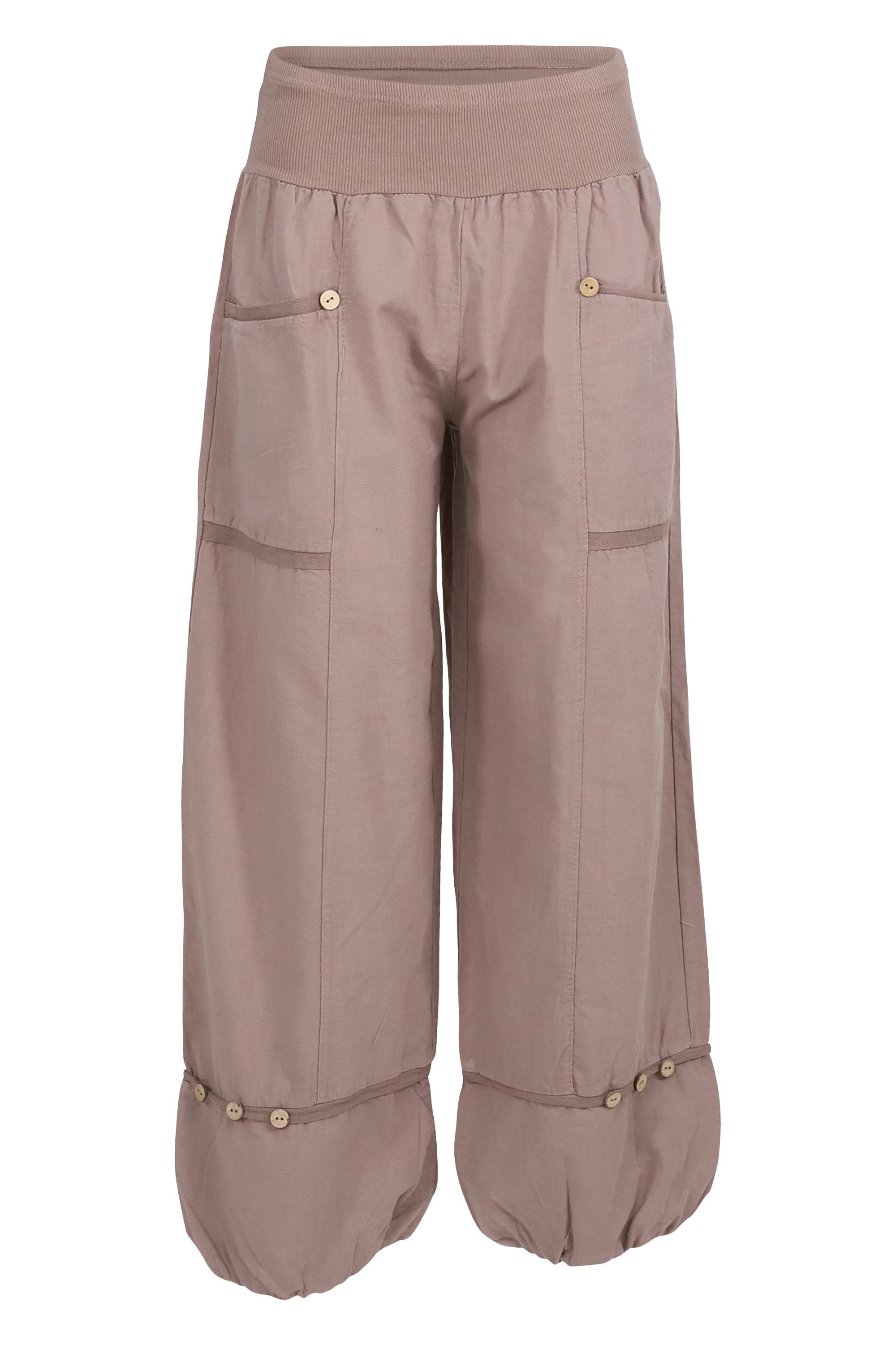 Besonderheiten: Diese stilvolle Damen-Leinenhose vereint Komfort und Lässigkeit – ideal für Freizeit, Urlaub, Strand oder entspannte Tage im Garten. Die hochwertige Materialmischung aus 50% Leinen und 50% Baumwolle sorgt für Atmungsaktivität und Langlebigkeit. Während Leinen kühlend und luftdurchlässig ist, verleiht Baumwolle der Hose Strapazierfähigkeit und ein angenehmes Hautgefühl. Der elastische Bund passt sich jeder Figur an, ohne einzuengen, und bietet maximalen Tragekomfort. Die lockere Passform ermöglicht uneingeschränkte Bewegungsfreiheit, ideal für heiße Sommertage. Der Gummizug am Beinabschluss sorgt für perfekten Sitz, ohne zu verrutschen, während der luftige Schnitt eine schmeichelhafte Silhouette zaubert. Praktische Details wie zwei Eingrifftaschen bieten Platz für kleine Alltagsgegenstände, und der dekorative Holzknopf setzt einen stilvollen Akzent. Das minimalistische Design macht die Hose zu einem vielseitigen Begleiter, der sich mit Shirts für einen entspannten Sommerlook oder mit einer Bluse für ein elegantes Outfit kombinieren lässt. Ob beim Stadtbummel, am Strand oder zum Relaxen – diese Hose ist ein echter Allrounder für warme Tage.