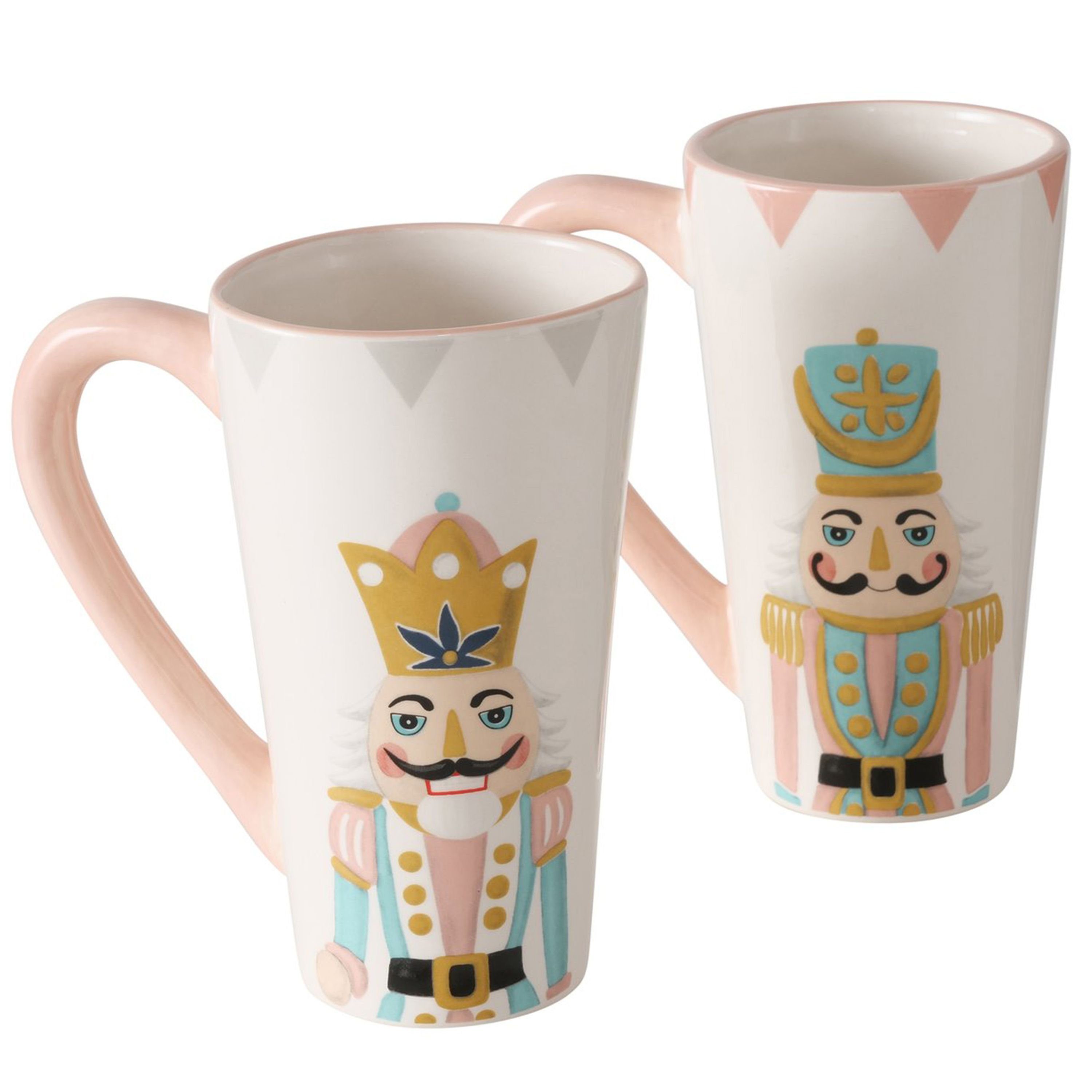Der eine Becher ist am oberen Rand mit rosafarbenen Wimpeln und einem lächelnden Nussknacker mit Hut versehen. Die andere Tasse ziert oben ein graues Wimpelband und zeigt einen grinsenden Nussknacker mit Krone. Beide sind im Grundton Weiß und haben einen breiten rosafarbenen Henkel.