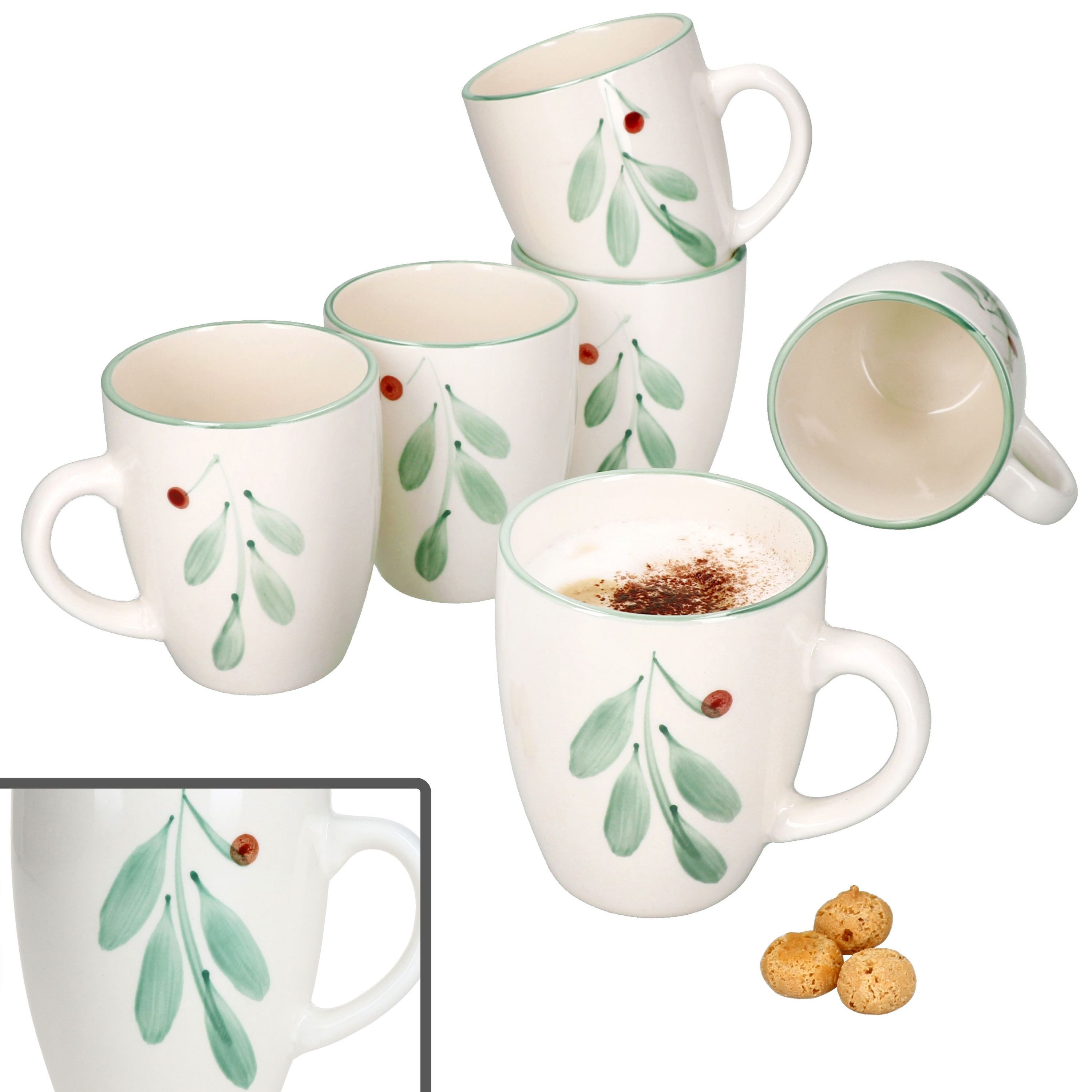 Die runden Becher mit Henkel sind in einem cremefarbenen Grundton gehalten. Außen ist vorn und hinten ein grüner Mistelzweig mit einer roten Beere zu sehen. Den Abschluss macht oben ein passender grüner Rand, der das Gesamtbild vervollständigt.