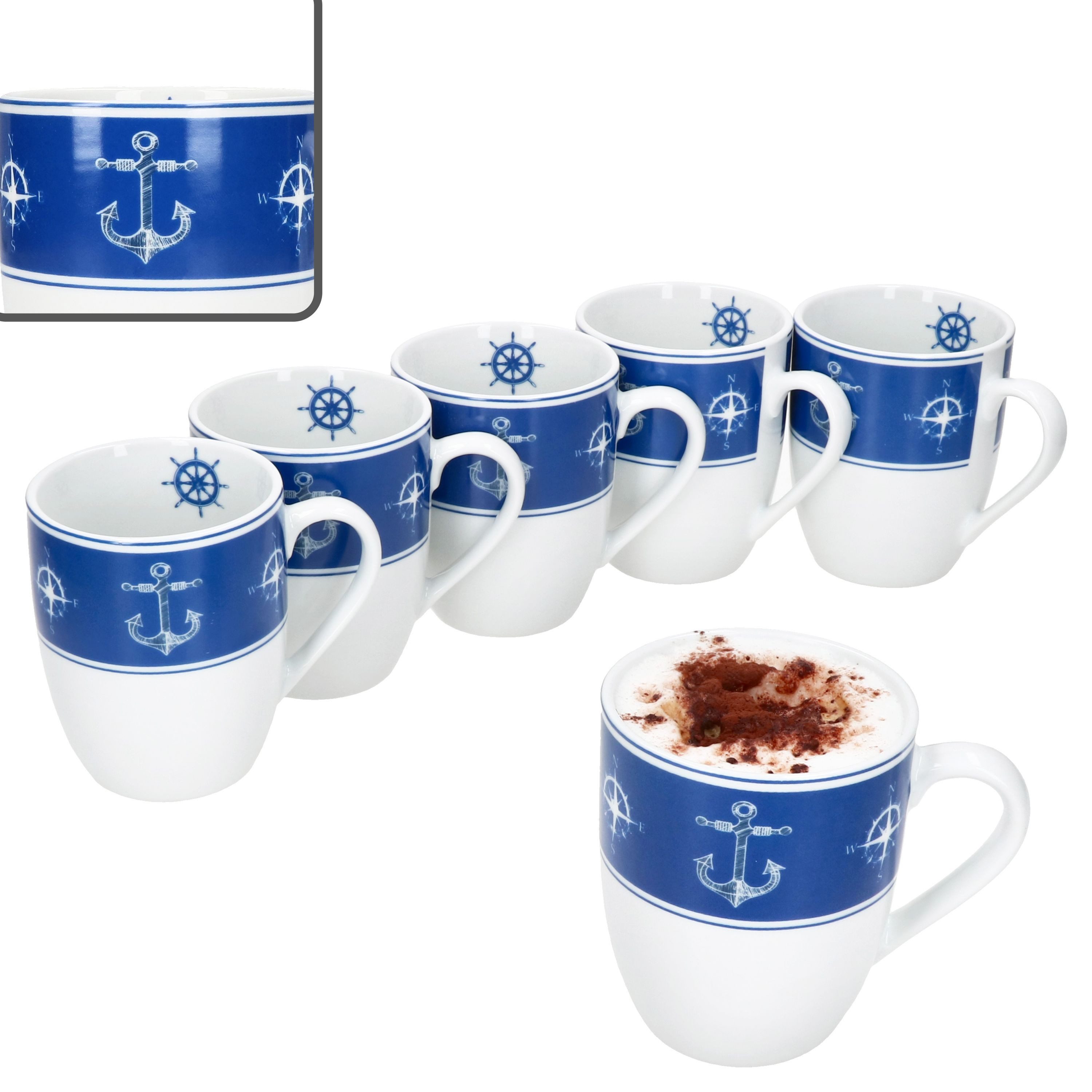 Die runden Kaffeebecher sind in schickem Weiß gehalten und außen mit einem breiten Band sowie zwei feinen Linien in Blau versehen. Auf dem breiten Band sind in Weiß nautische Symbole wie Anker, Steuerräder und Windrosen zu sehen. Der absolute Hingucker ist aber das kleine blaue Steuerrad, das im Inneren der Tasse abgebildet ist und so das ganze Design perfekt abrundet.