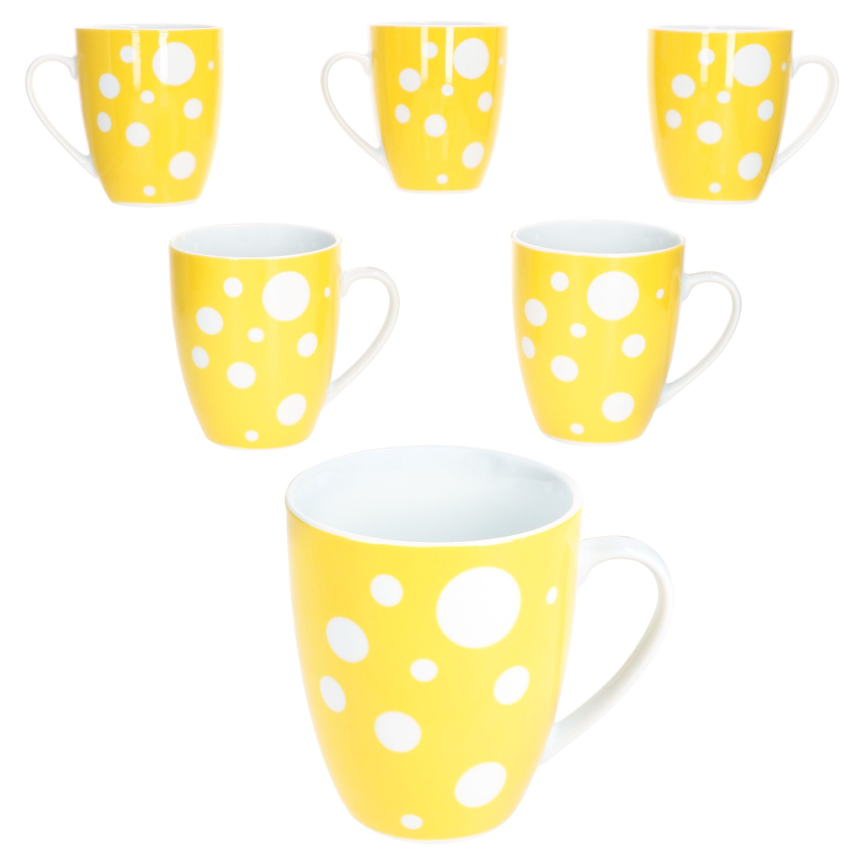 Die runden Kaffeebecher sorgen durch das gepunktete Design für eine freundliche und zugleich lebhafte Atmosphäre. Während Innenseite des Bechers schlicht in Weiß gehalten ist, überzeugt er außen durch einen wunderhübschen warmen Gelbton, der mit kleinen und großen weißen Punkten versehen ist.