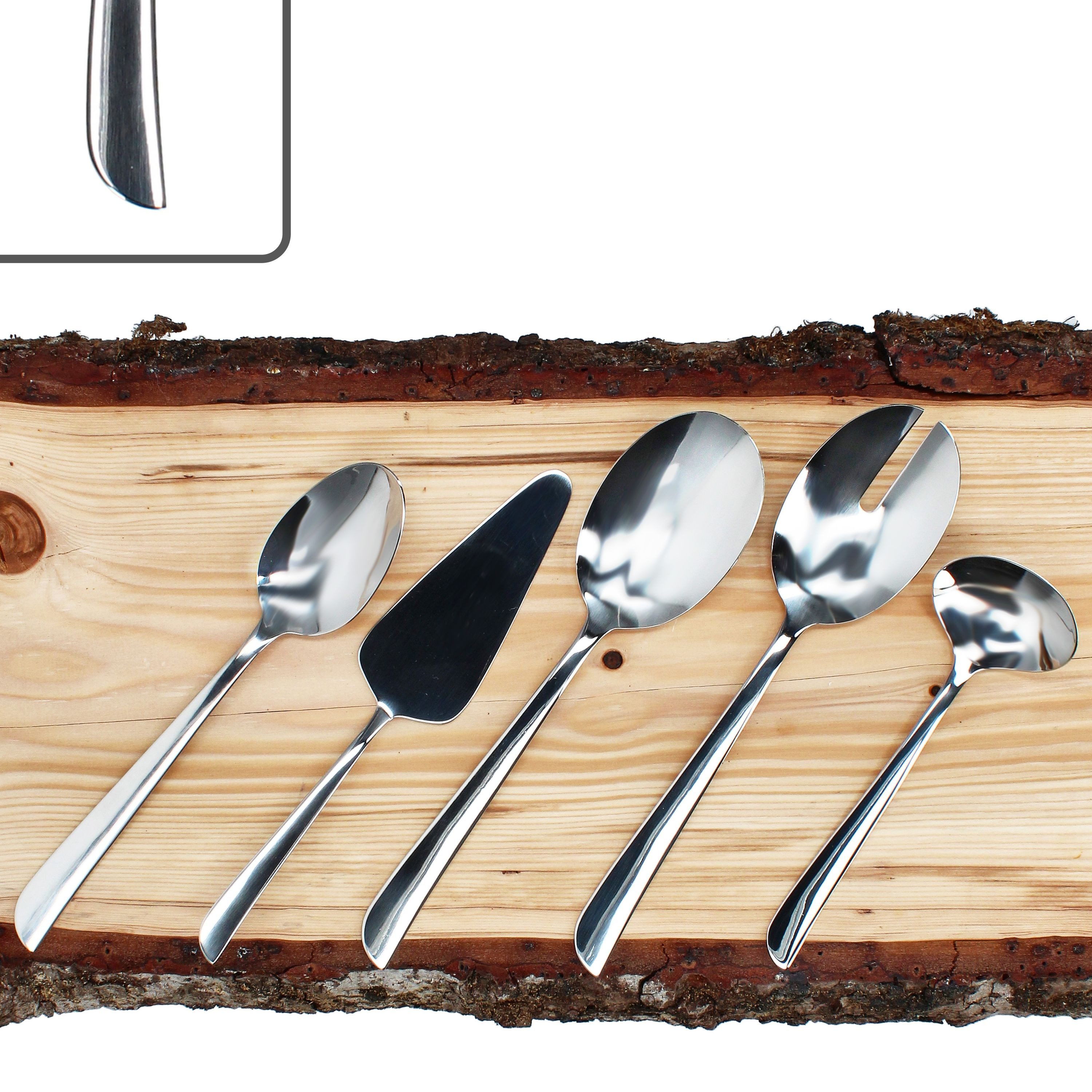 Das Komplett-Set beinhaltet einen Tortenheber, eine Salatgabel mit Salatlöffel, einen Servierlöffel und einen Saucenlöffel. So können Sie sowohl Saucen und Dips, als auch gemischte Salate, Nachspeisen sowie Kuchen oder Torte perfekt servieren.