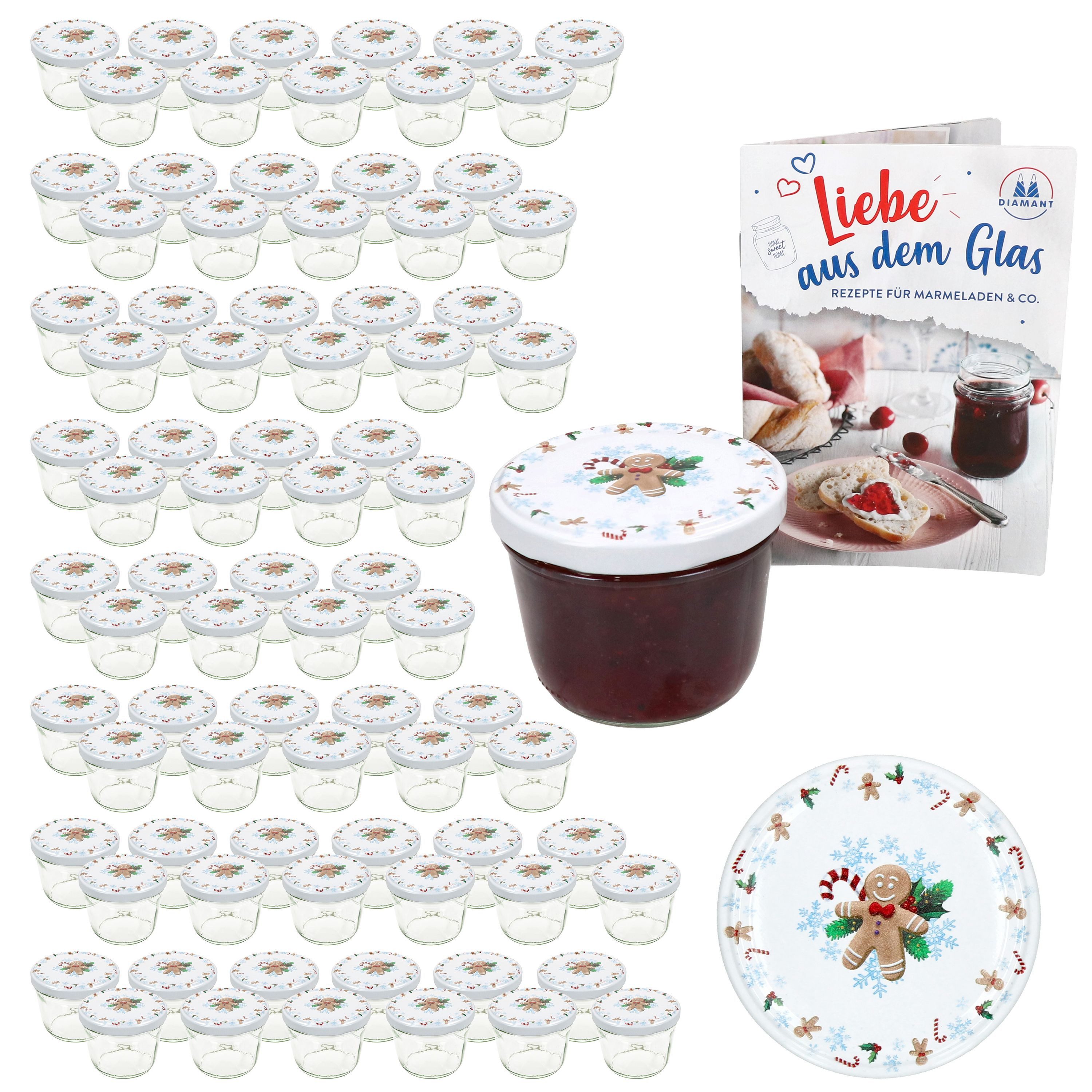 Mit diesem 100er Set 230 ml Sturzgläser inklusive Twist-Off-Deckel mit Lebkuchenmännchen und eisblauem Weihnachtsdekor darauf sowie GRATIS Rezeptheft sind Sie bestens ausgestattet, um die unterschiedlichsten Leckereien einzukochen.