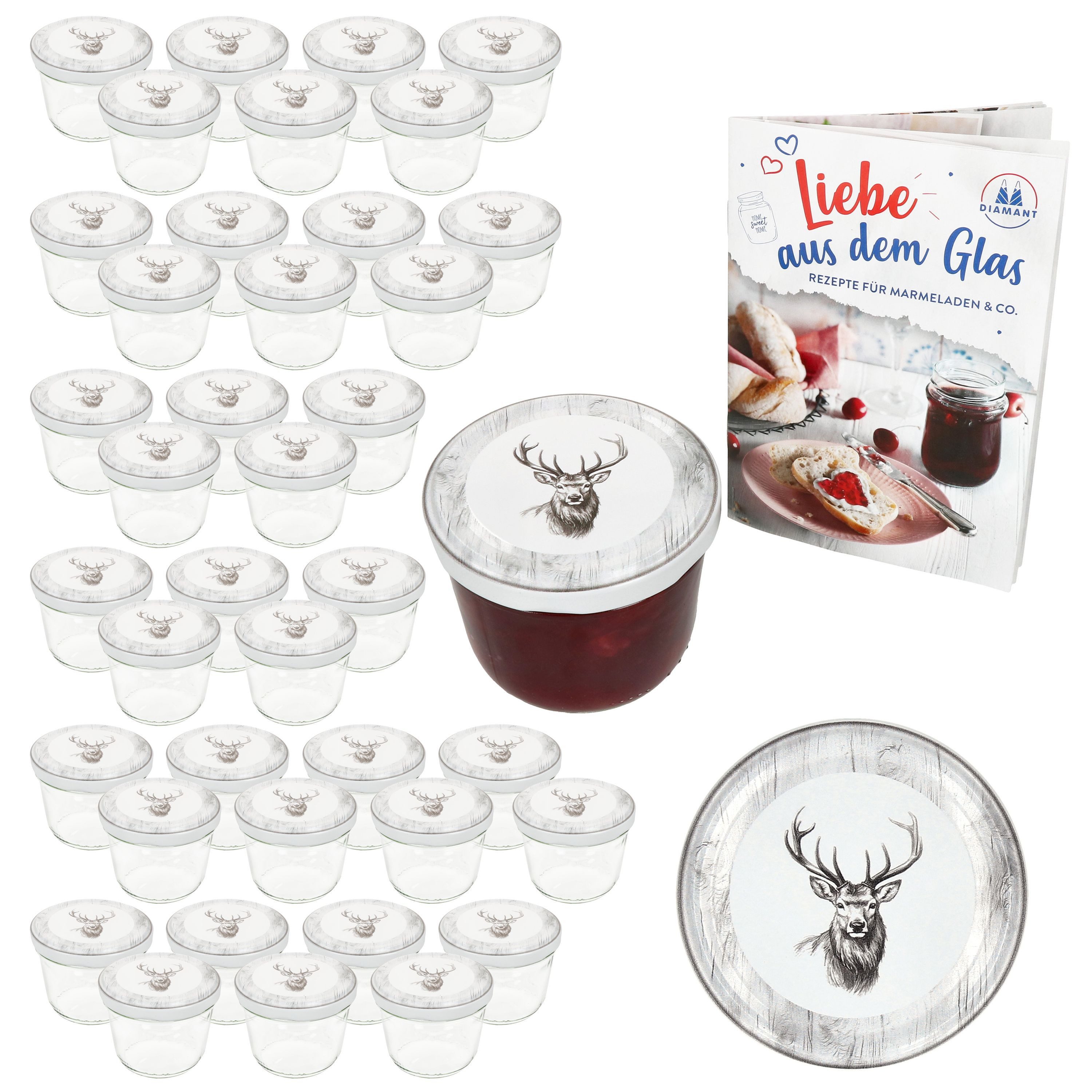 Mit diesem 40er Set 230 ml Sturzgläser inklusive Twist-Off-Deckel Alois mit schwarz-weißem Hirsch-Dekor und Rand mit Holz-Optik darauf sowie GRATIS Rezeptheft sind Sie bestens ausgestattet, um die unterschiedlichsten Leckereien einzukochen.