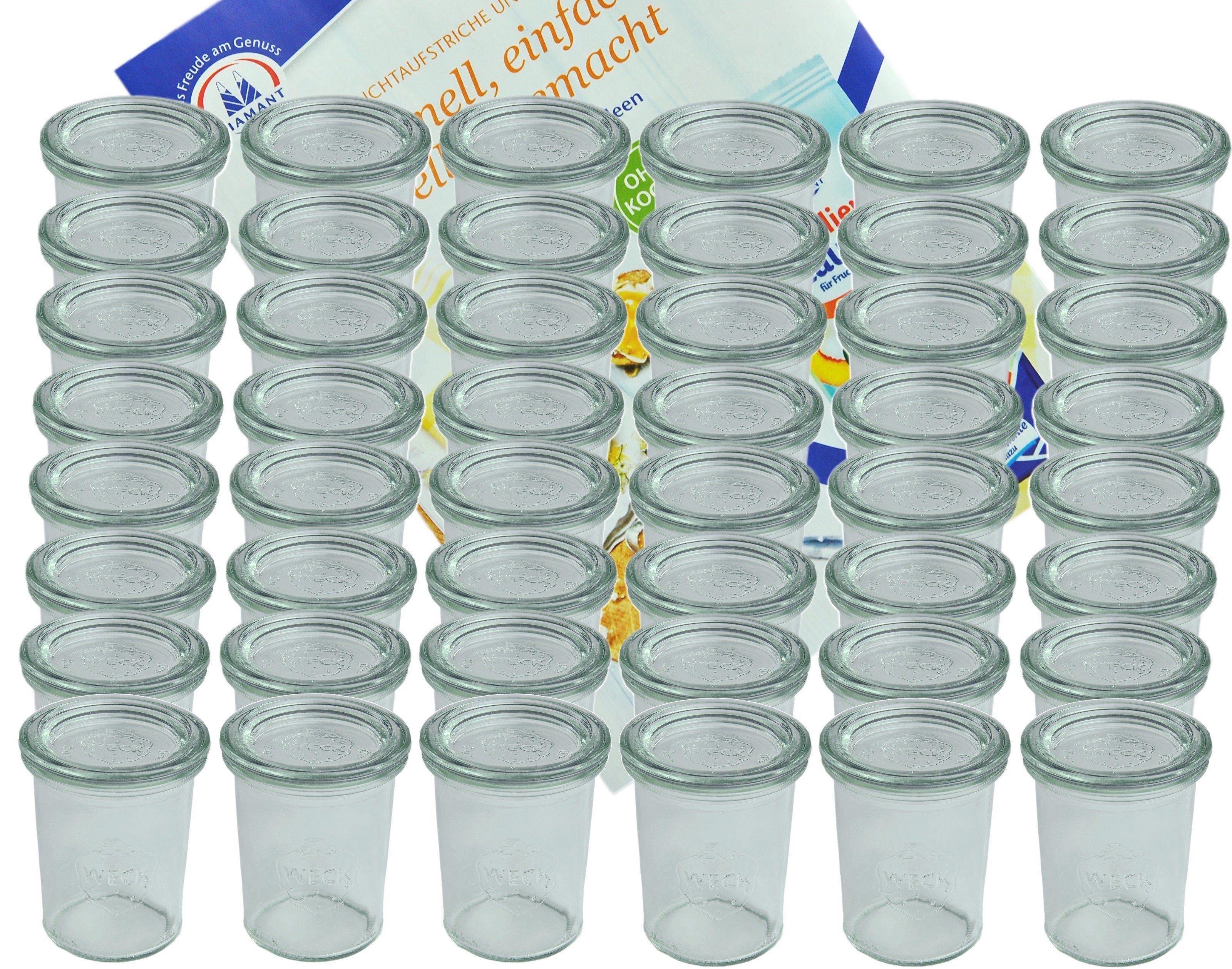 48er Set Sturzgläser á 160 ml mit Glasdeckel incl. Diamant-Zucker Gelierzauber Rezeptheft