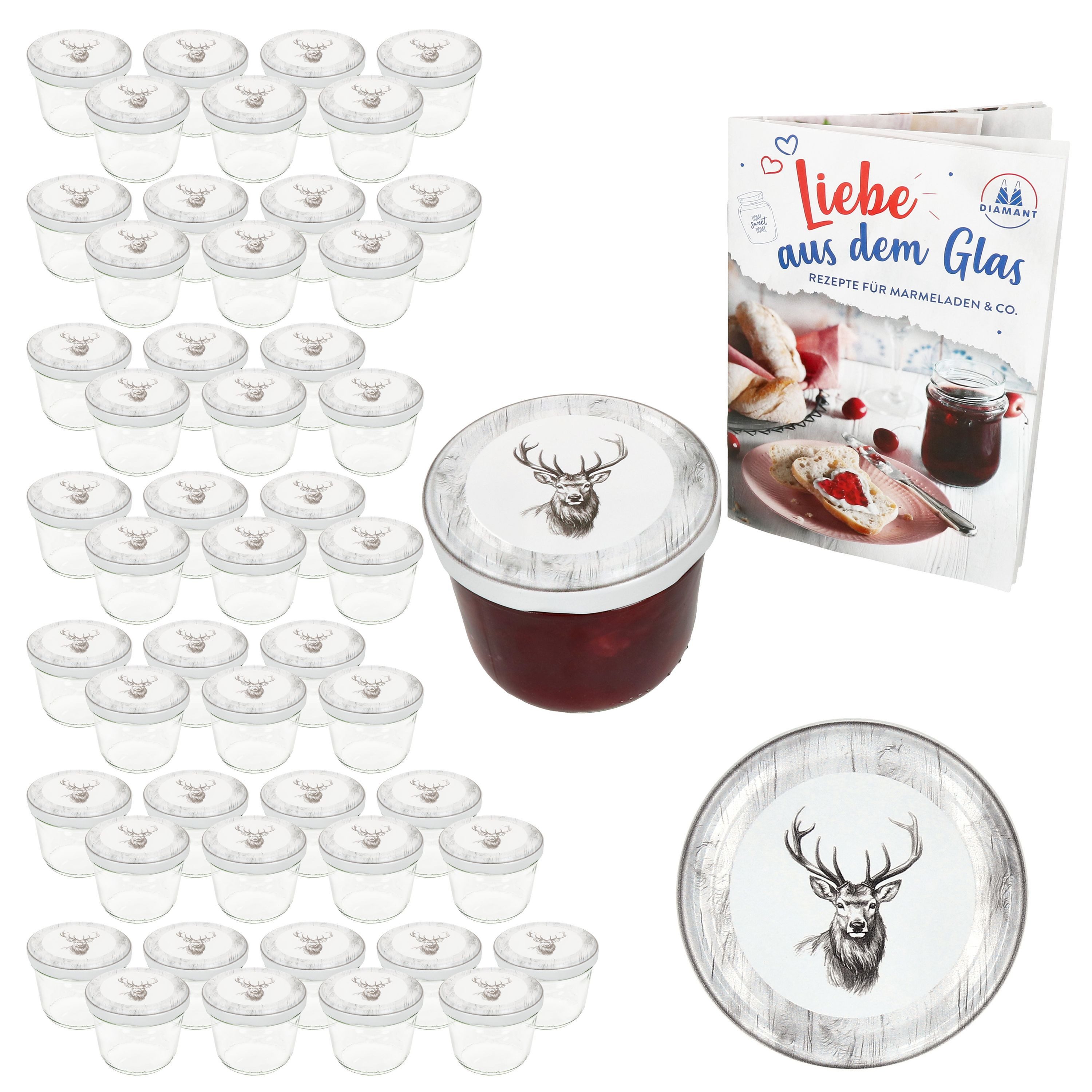 Mit diesem 50er Set 230 ml Sturzgläser inklusive Twist-Off-Deckel Alois mit schwarz-weißem Hirsch-Dekor und Rand mit Holz-Optik darauf sowie GRATIS Rezeptheft sind Sie bestens ausgestattet, um die unterschiedlichsten Leckereien einzukochen.