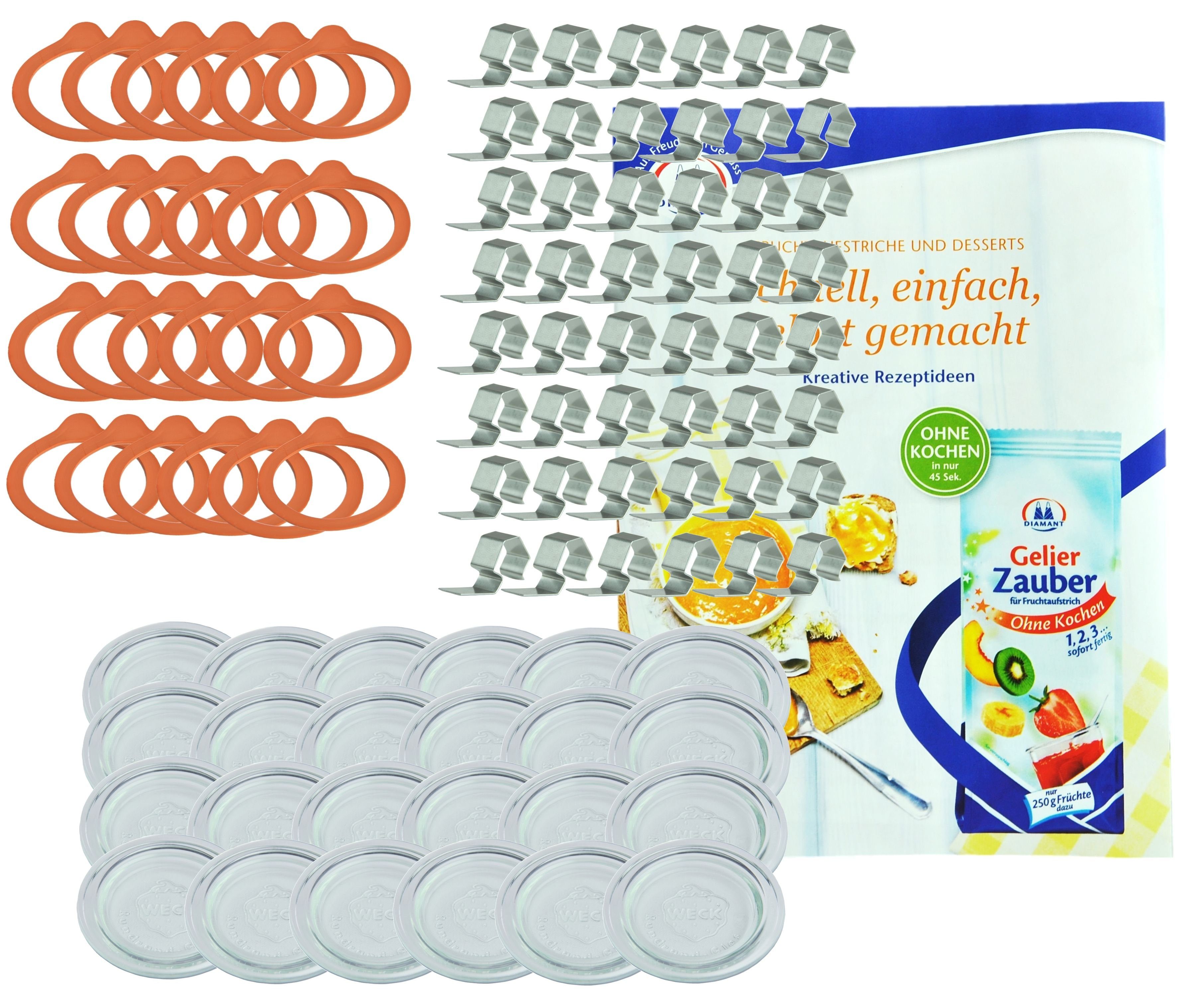 ORIGINAL WECK-Einkoch-Set - 24 Glasdeckel für Rundrandglas 60 mm + 24 Einkochringe + 48 Weck-Klammern + GRATIS Rezeptheft, Ersatzdeckel aus Glas, transparent, WECK-Rundrandgläser RR60, wiederverwendbar