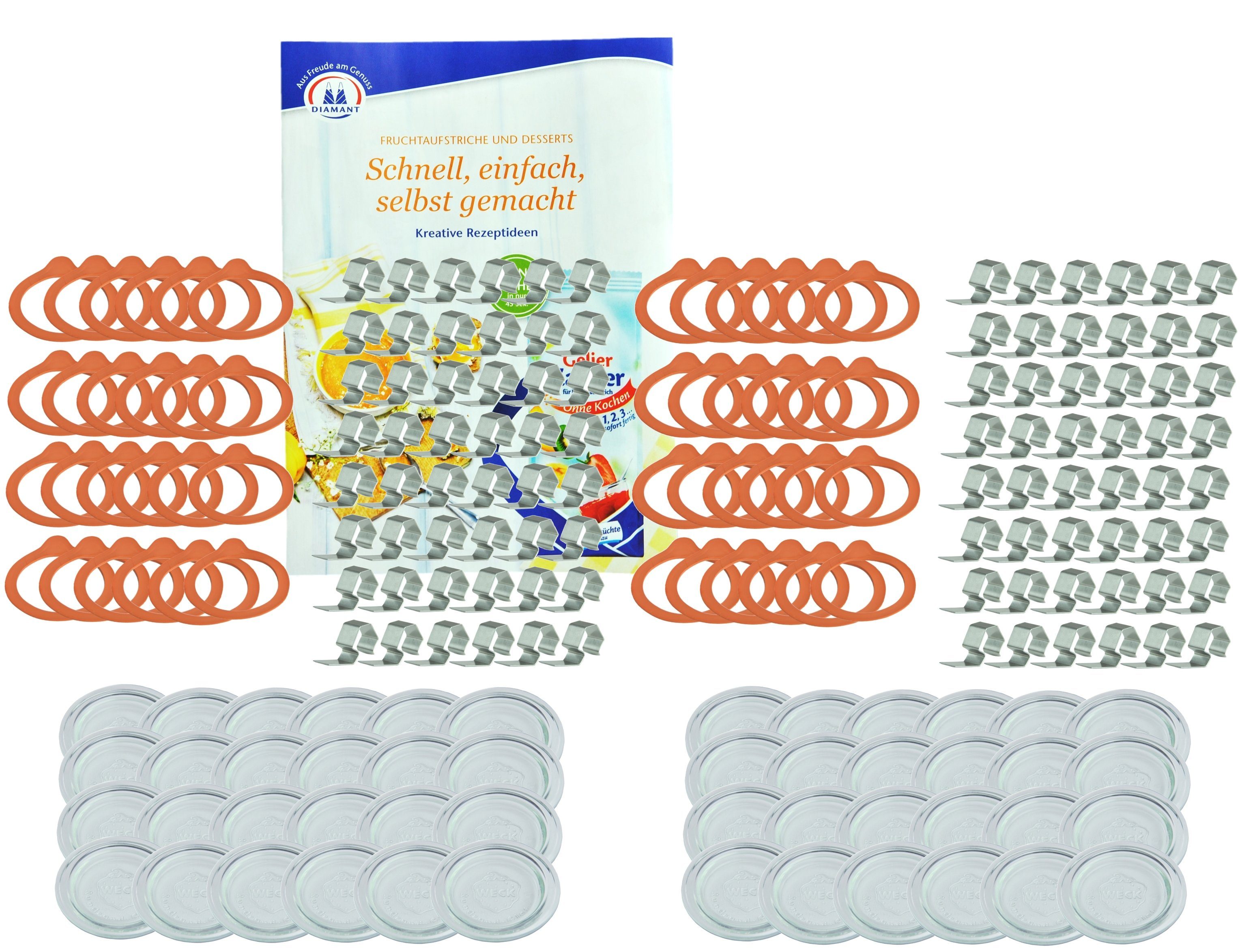 ORIGINAL WECK-Einkoch-Set - 48 Glasdeckel für Rundrandglas 100 mm + 48 Einkochringe + 96 Weck-Klammern + GRATIS Rezeptheft, Ersatzdeckel aus Glas, transparent, WECK-Rundrandgläser RR100, wiederverwendbar
