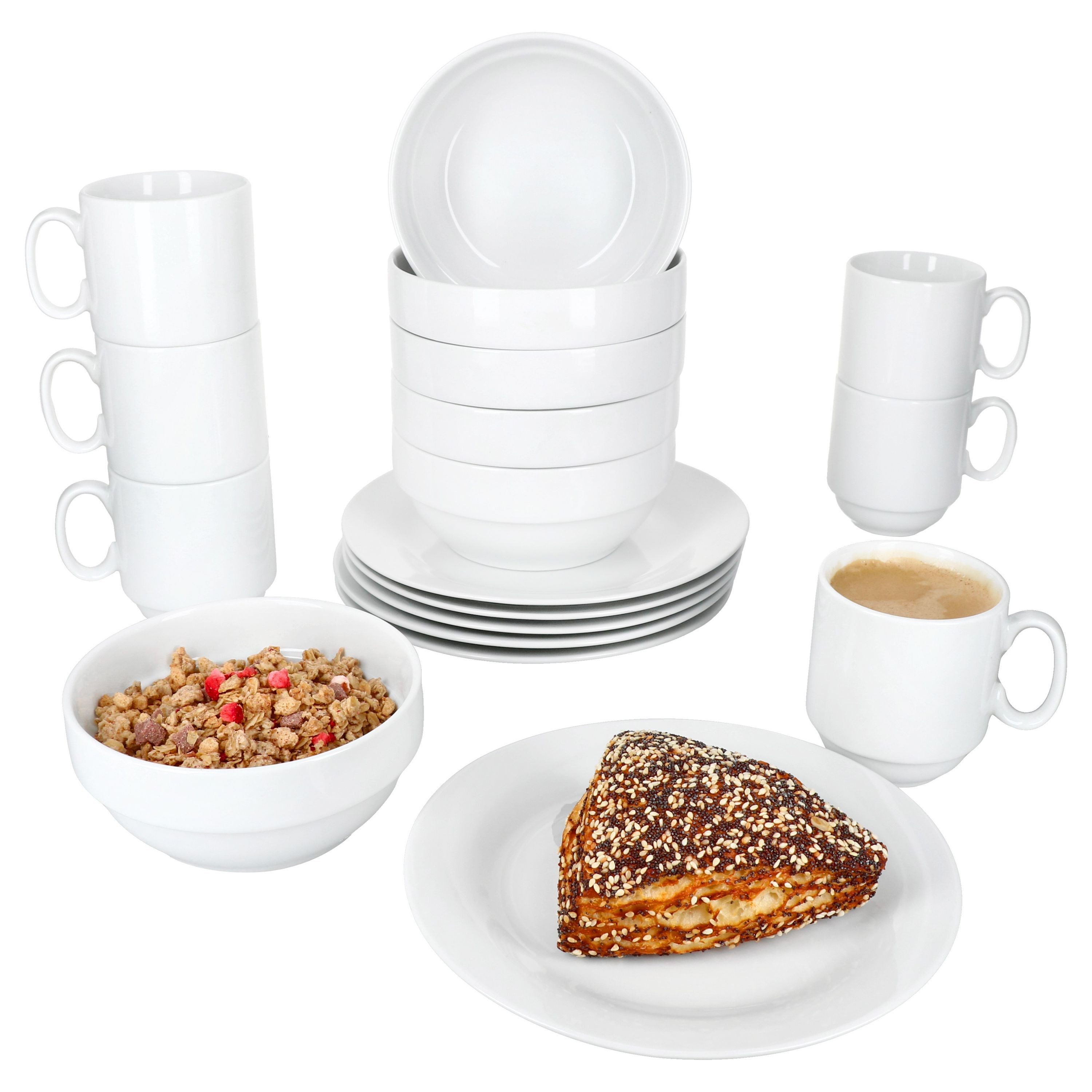 Genießen Sie das zeitlose 18-teilige Frühstücksset Tommy aus weißem Porzellan und präsentieren Ihr Frühstück auf stilvolle und elegante Weise.