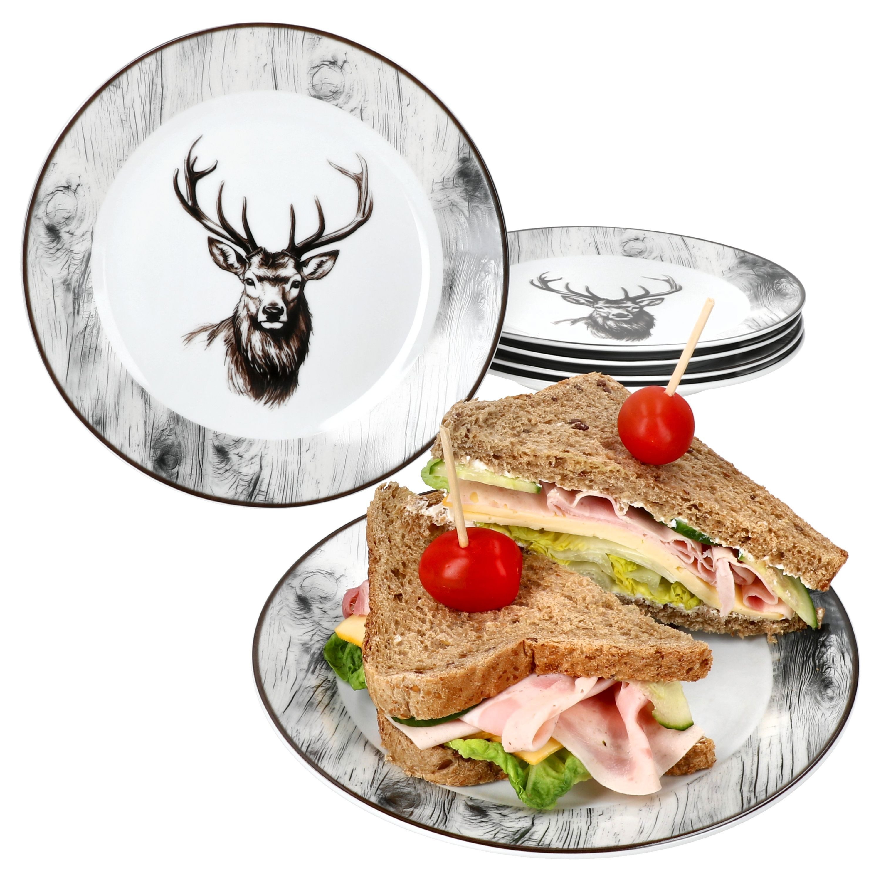 Die kleinen Teller verzaubern mit einer einzigartigen Holz-Optik am Rand, welche mit einer außergewöhnlichen Maserung versehen ist. Auf dem Spiegel des Tellers ist zudem noch ein filigran gezeichneter Hirschkopf zu sehen, der das Gesamtbild perfekt abrundet. Das komplette Dekor ist schlicht in schwarz-weiß gehalten, wodurch das Geschirr kinderleicht mit anderen Serien oder farbigen Dekoartikeln kombiniert werden kann. Das macht das Set zu der perfekten Ergänzung beim Frühstück, Brunch, Mittag und Abendbrot. Egal ob Sie Brot, Cole Slaw, frischen Erdbeerkuchen oder Fingerfood wie Pizzaschnecken anrichten möchten, diese Teller sind in jedem Fall die richtige Wahl.