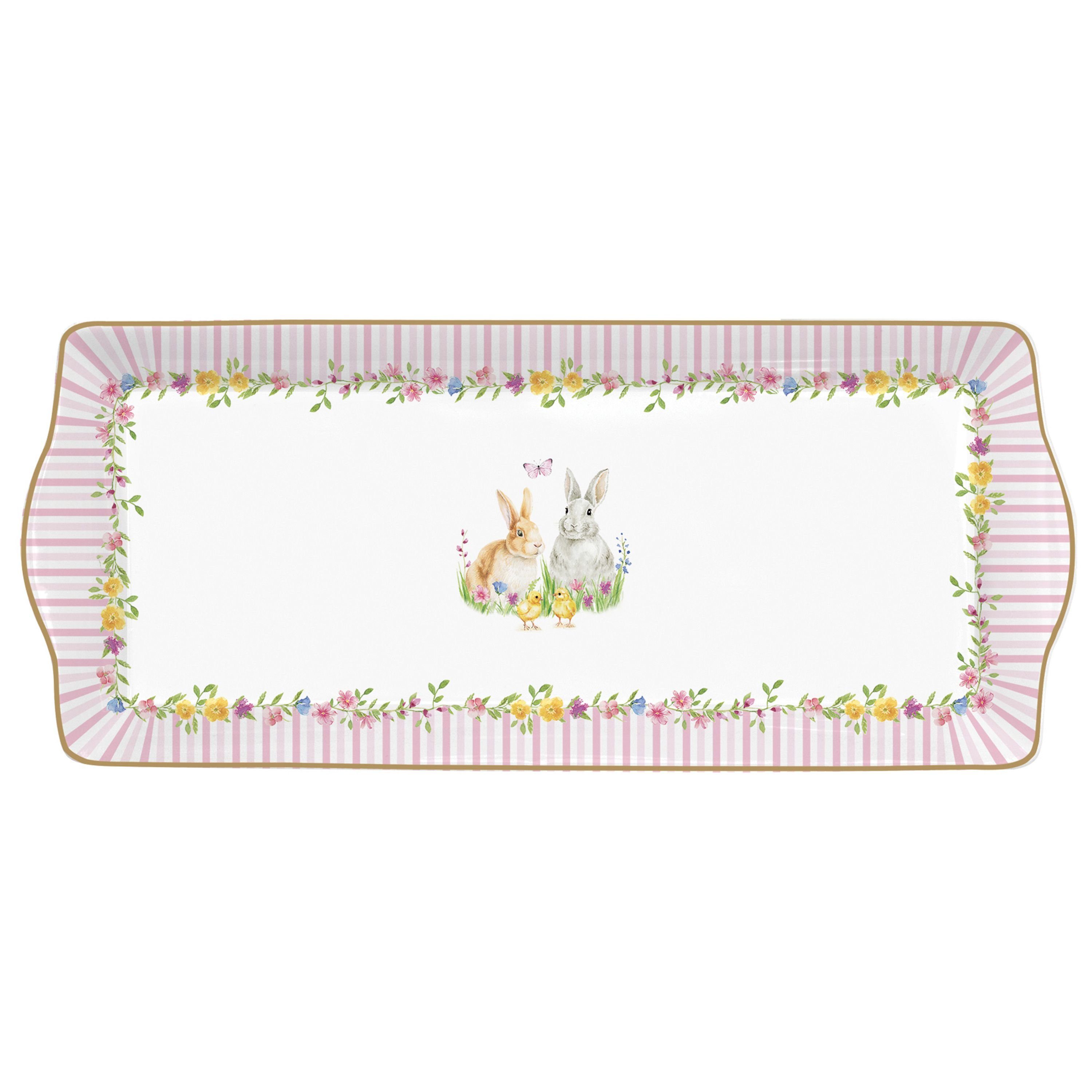 Die Kuchenplatte hat einen weißen Grundton und ist in der Mitte mit zwei süßen Hasen, zwei Küken und einem Schmetterling verziert, die niedlich dreinschauen und gemütlich auf einer Wiese sitzen. Der Rand ist außen mit rosa Streifen versehen und wird innen durch eine farbenfrohe Blumenranke ergänzt.